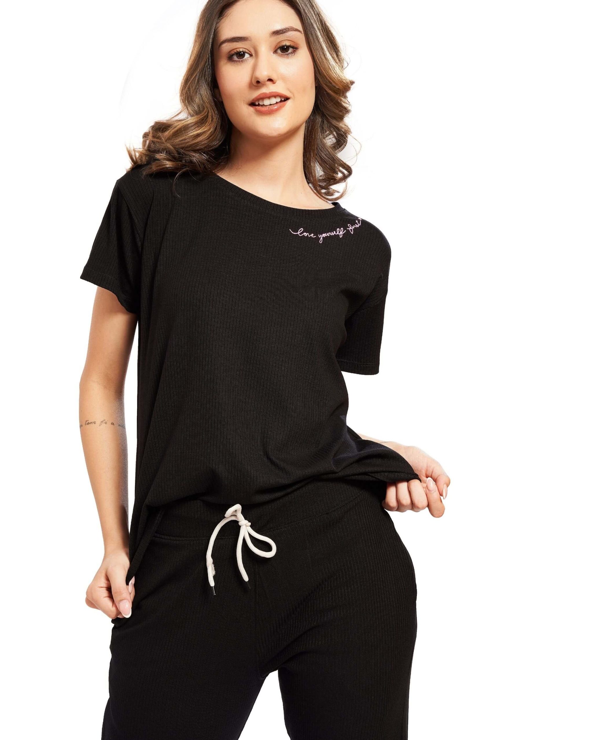 Crafted in breathable cotton fabric, the set is designed for lounging, casual outings, or laid-back travel looks. The empowering message adds a modern twist to a wardrobe essential.