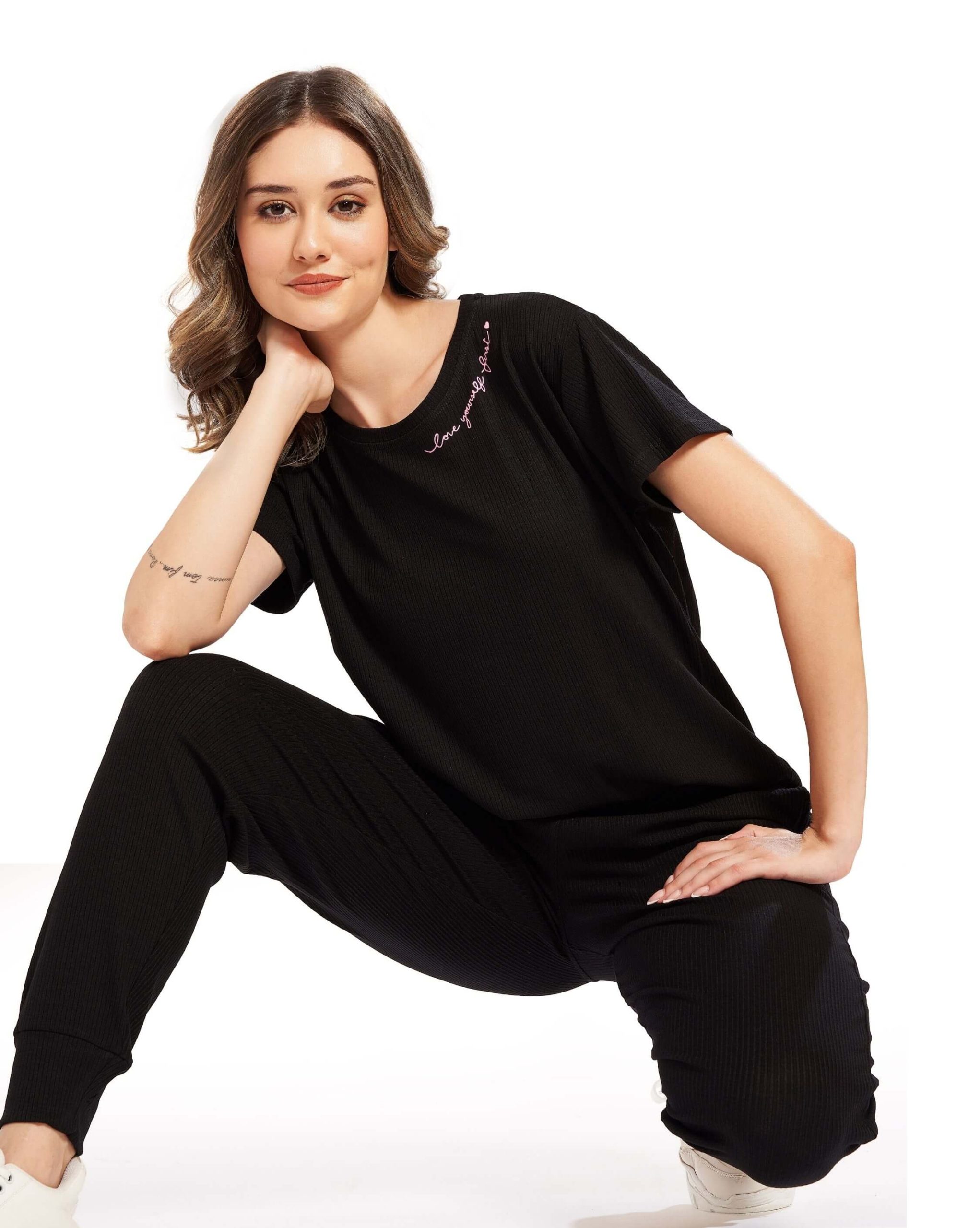 Embrace self-love in style with our Black “Love Yourself First” Co-ord Tracksuit Set for women. Featuring a bold printed crop top paired with matching joggers, this outfit is perfect for expressing confidence and comfort.