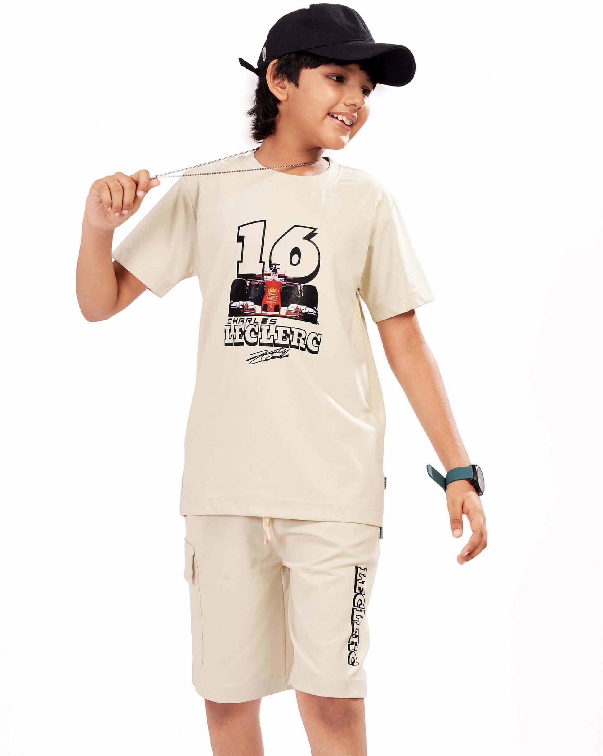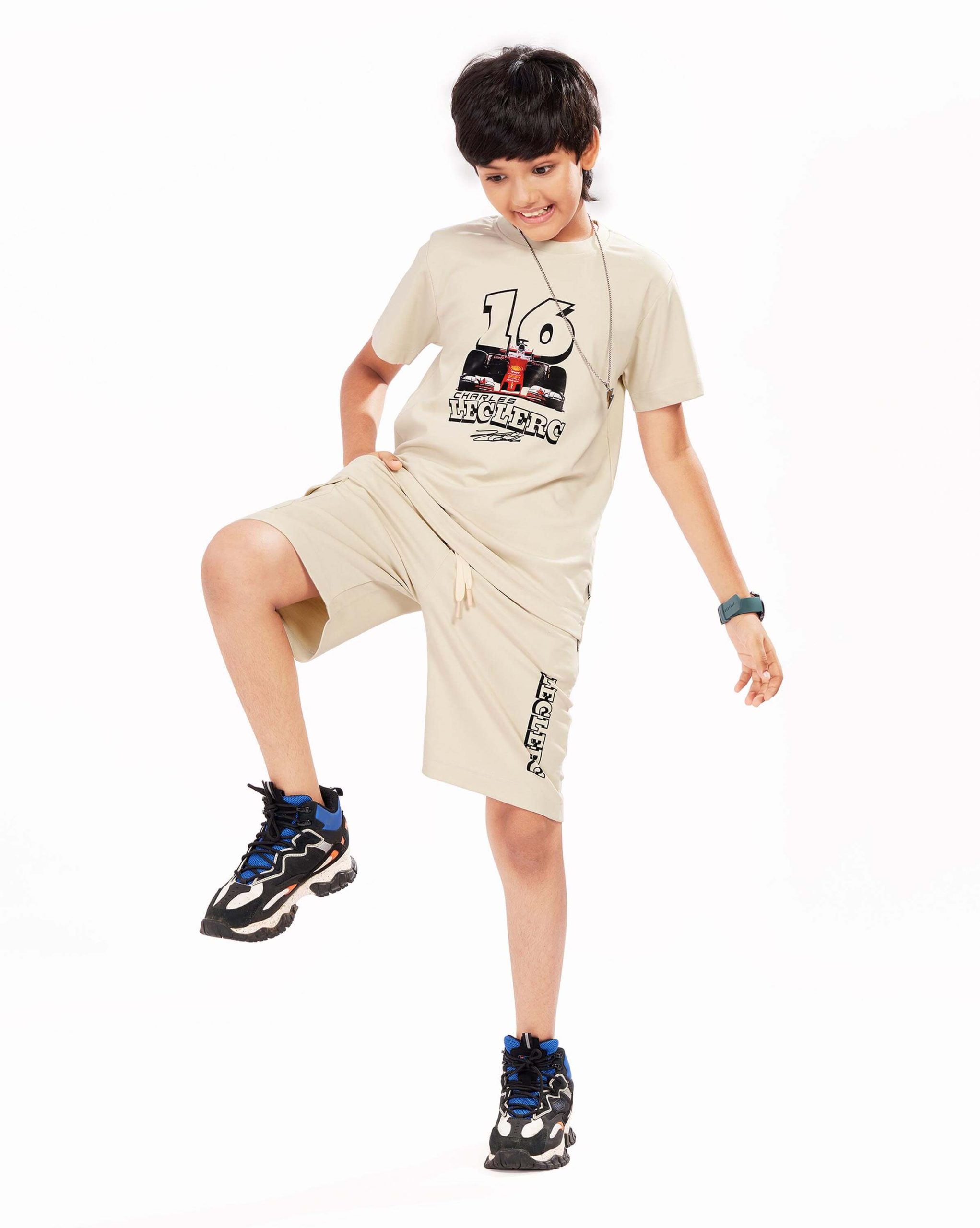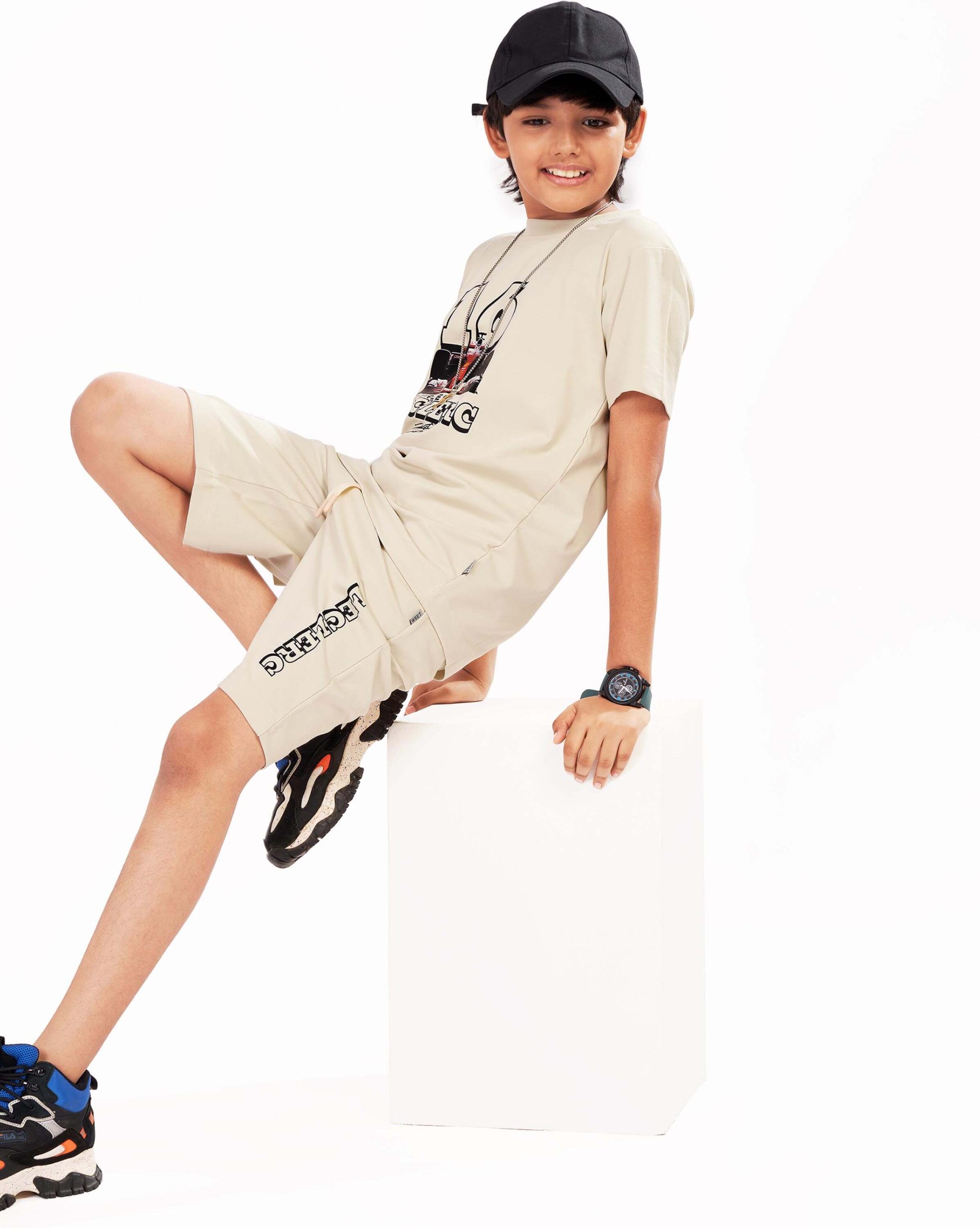 Boys Cotton Shorts Nightsuit Set | Printed T-Shirt & Shorts -Beige
