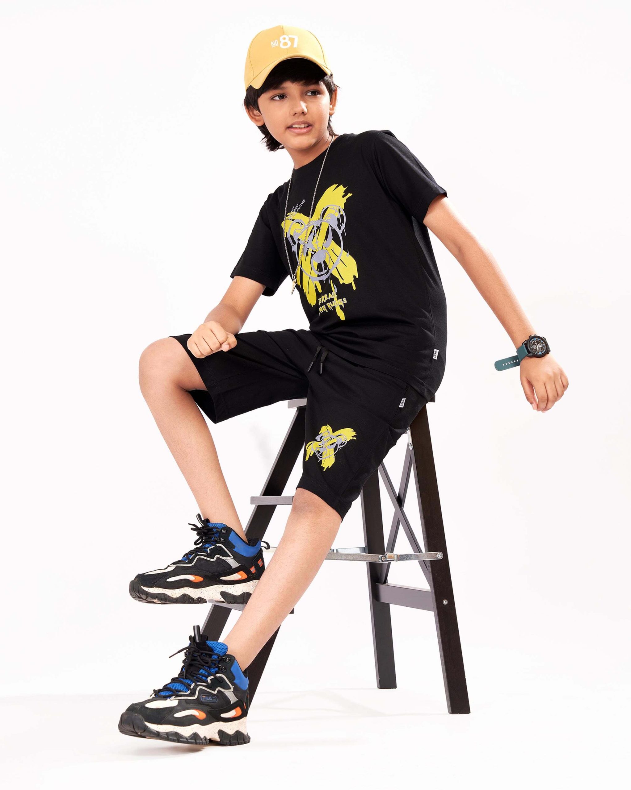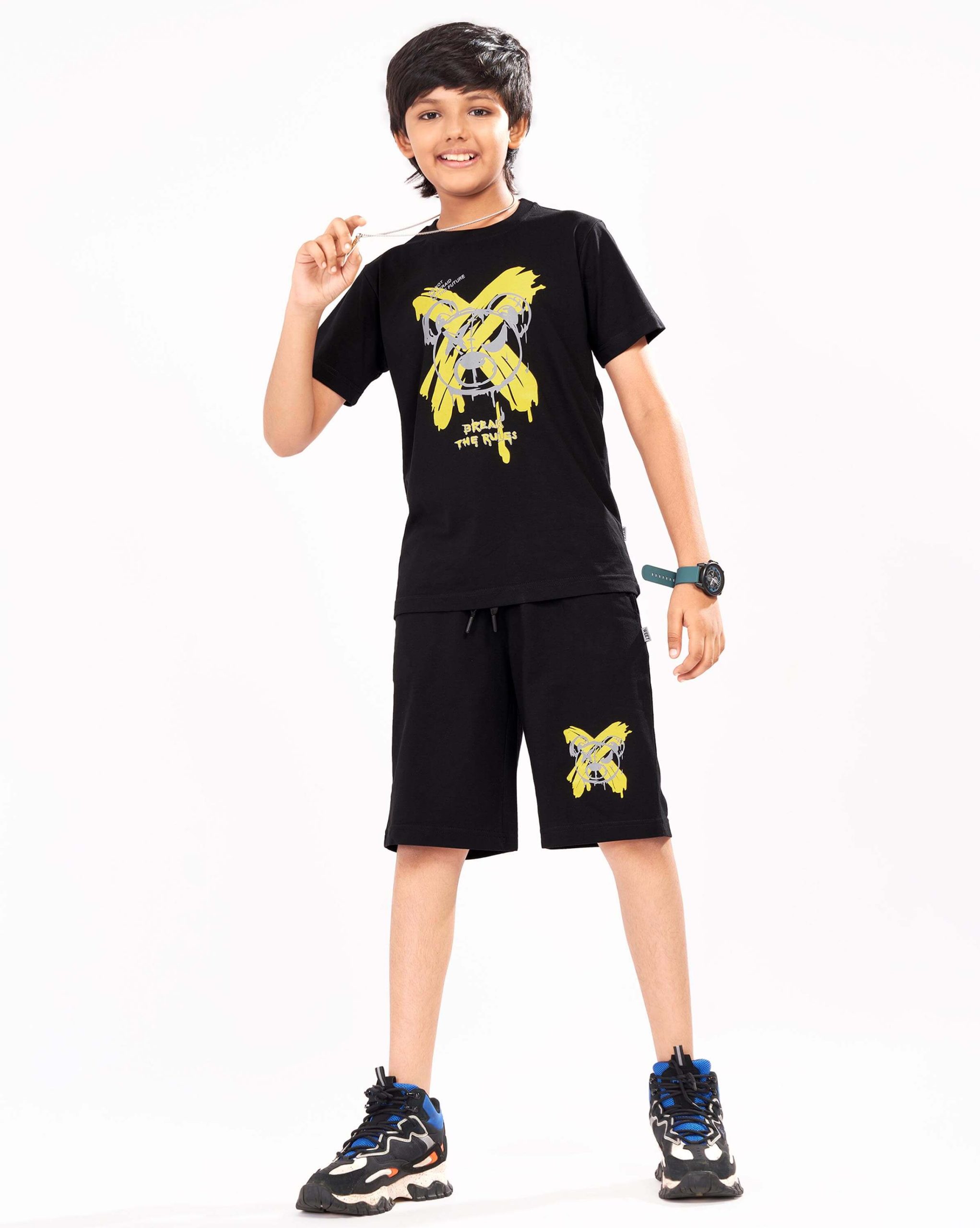 Boys Cotton Shorts Nightsuit Set | Printed T-Shirt & Shorts -Black