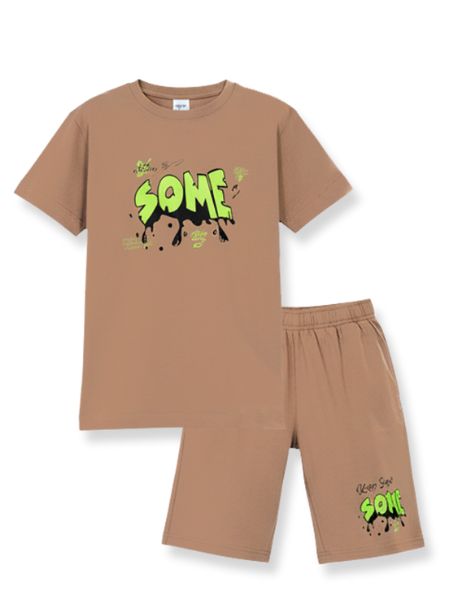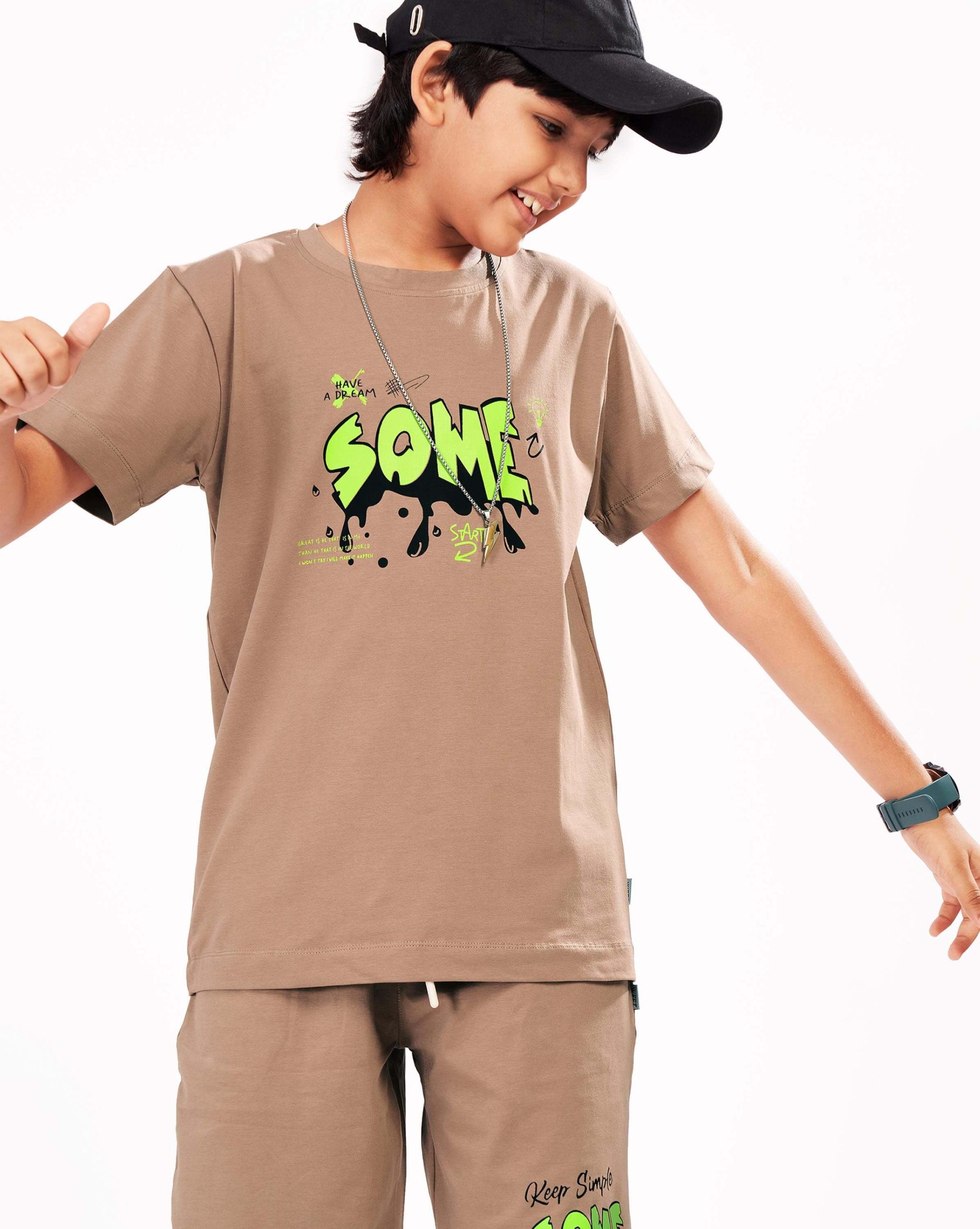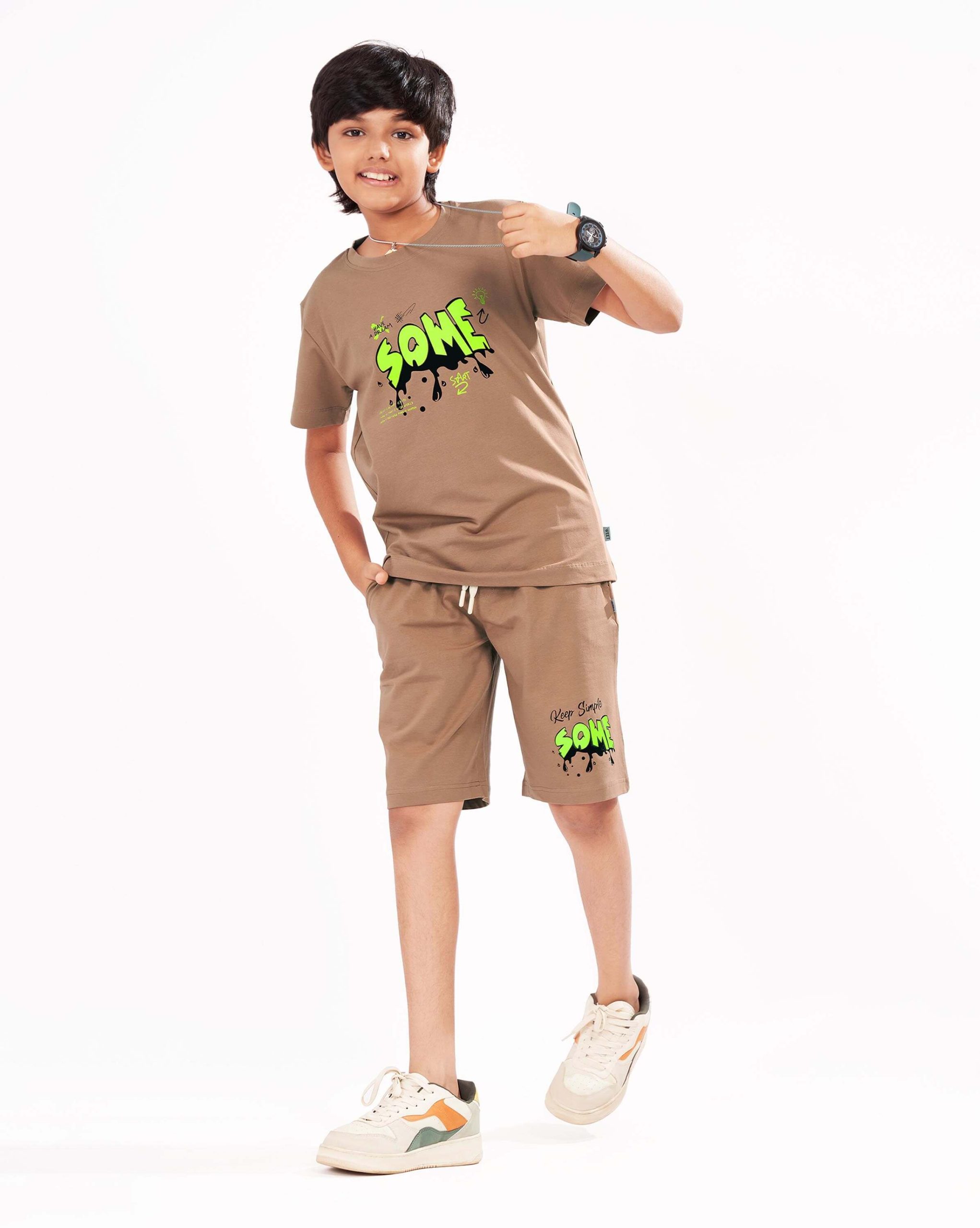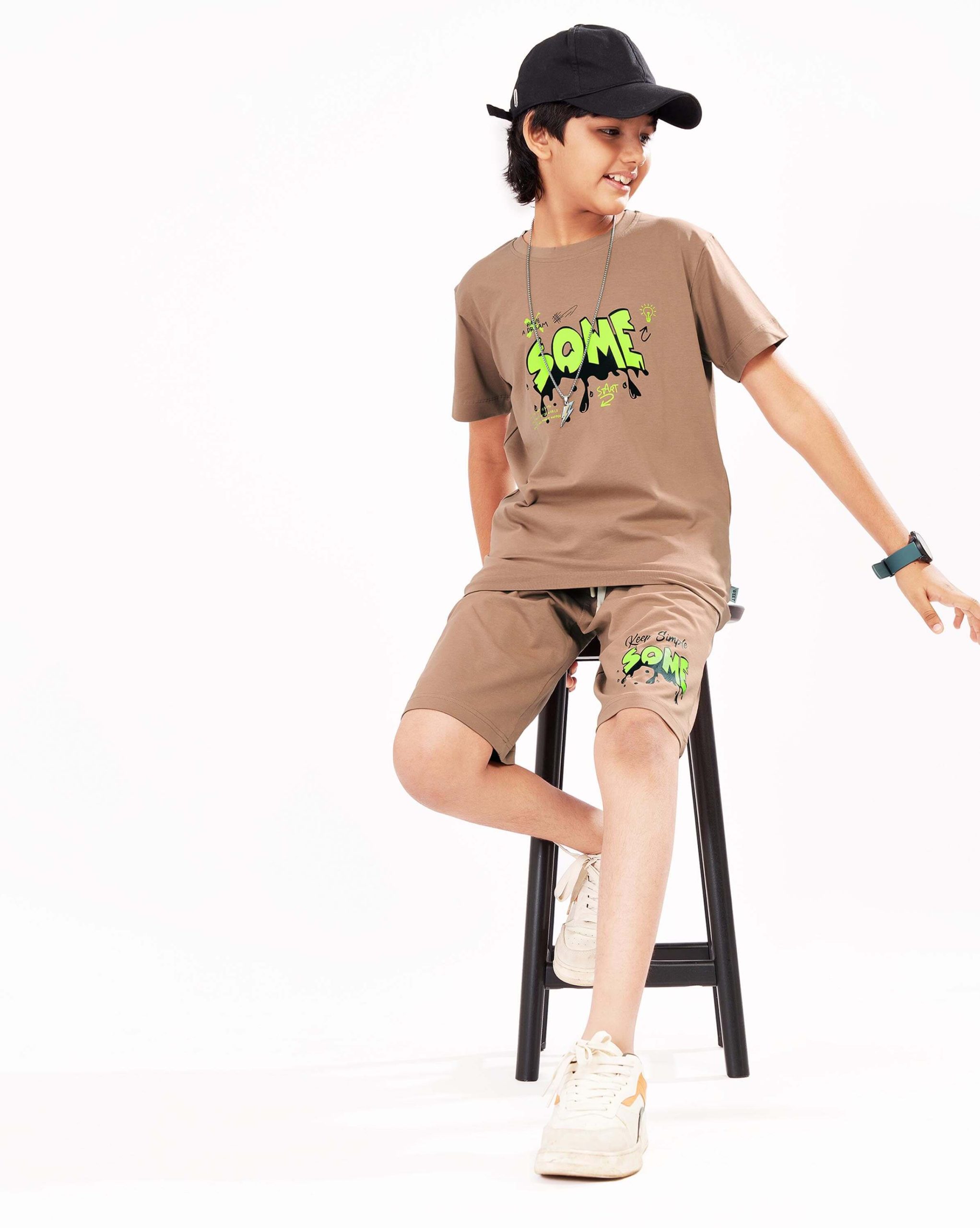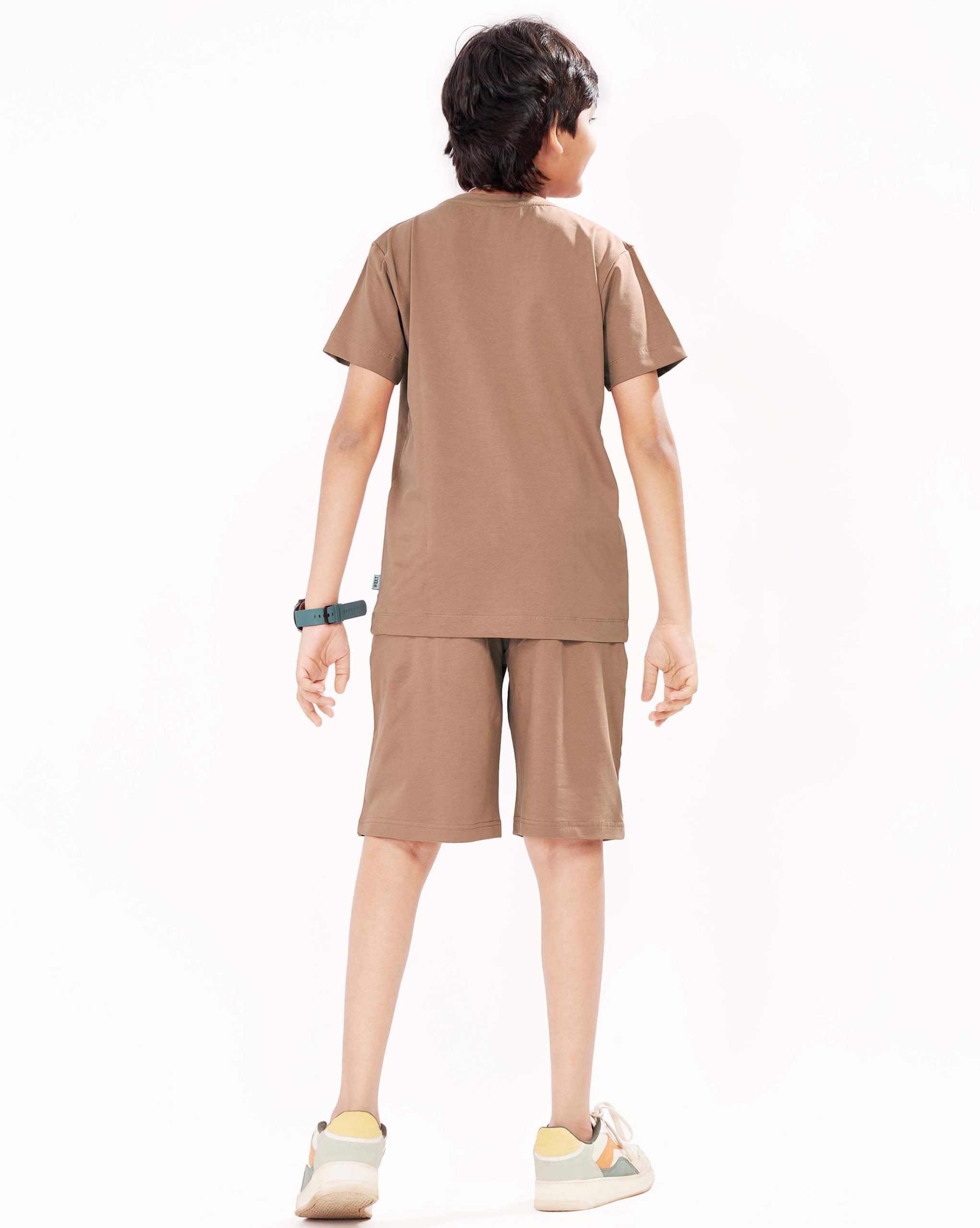 Boys Cotton Shorts Nightsuit Set | Printed T-Shirt & Shorts – Light Brown