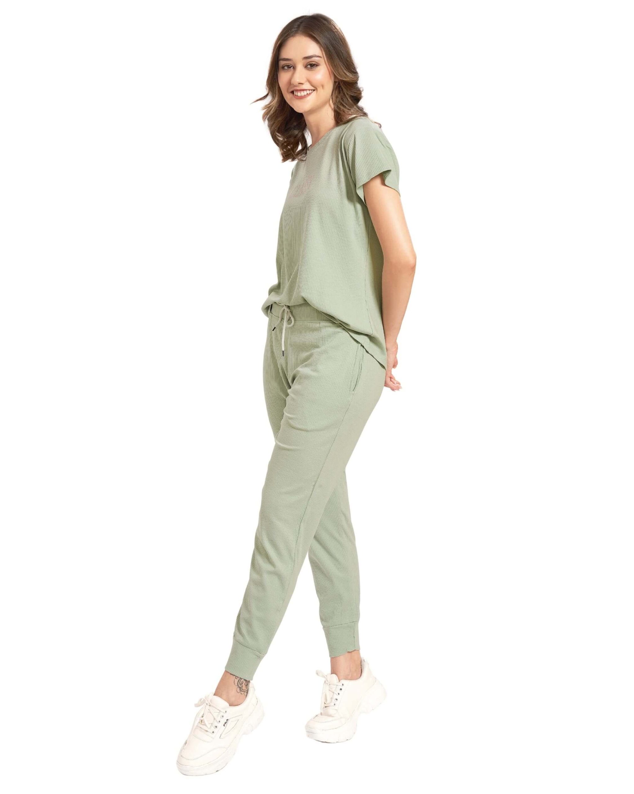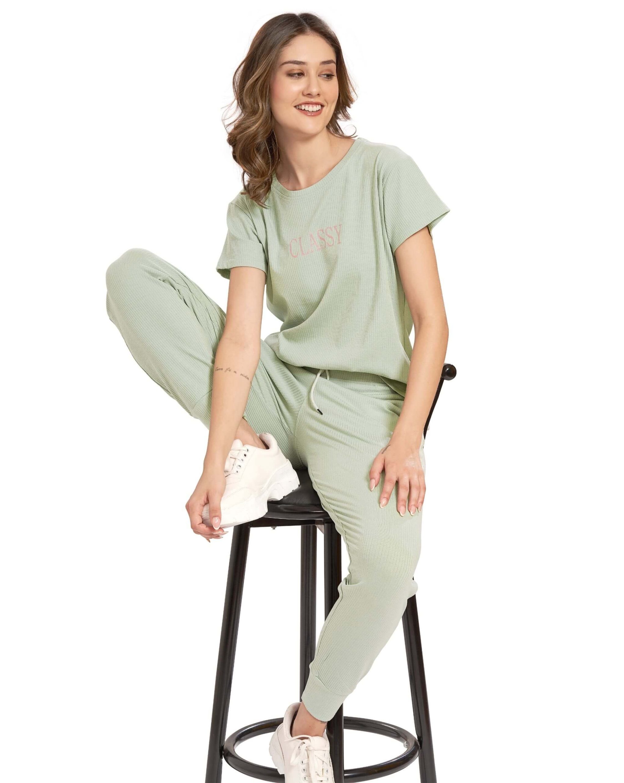 tay effortlessly stylish with our Light Olive Green Classy Co-ord Tracksuit Set for women. Made from soft cotton fabric, this set features a chic crop top with short sleeves and matching joggers – designed for both comfort and modern flair.
