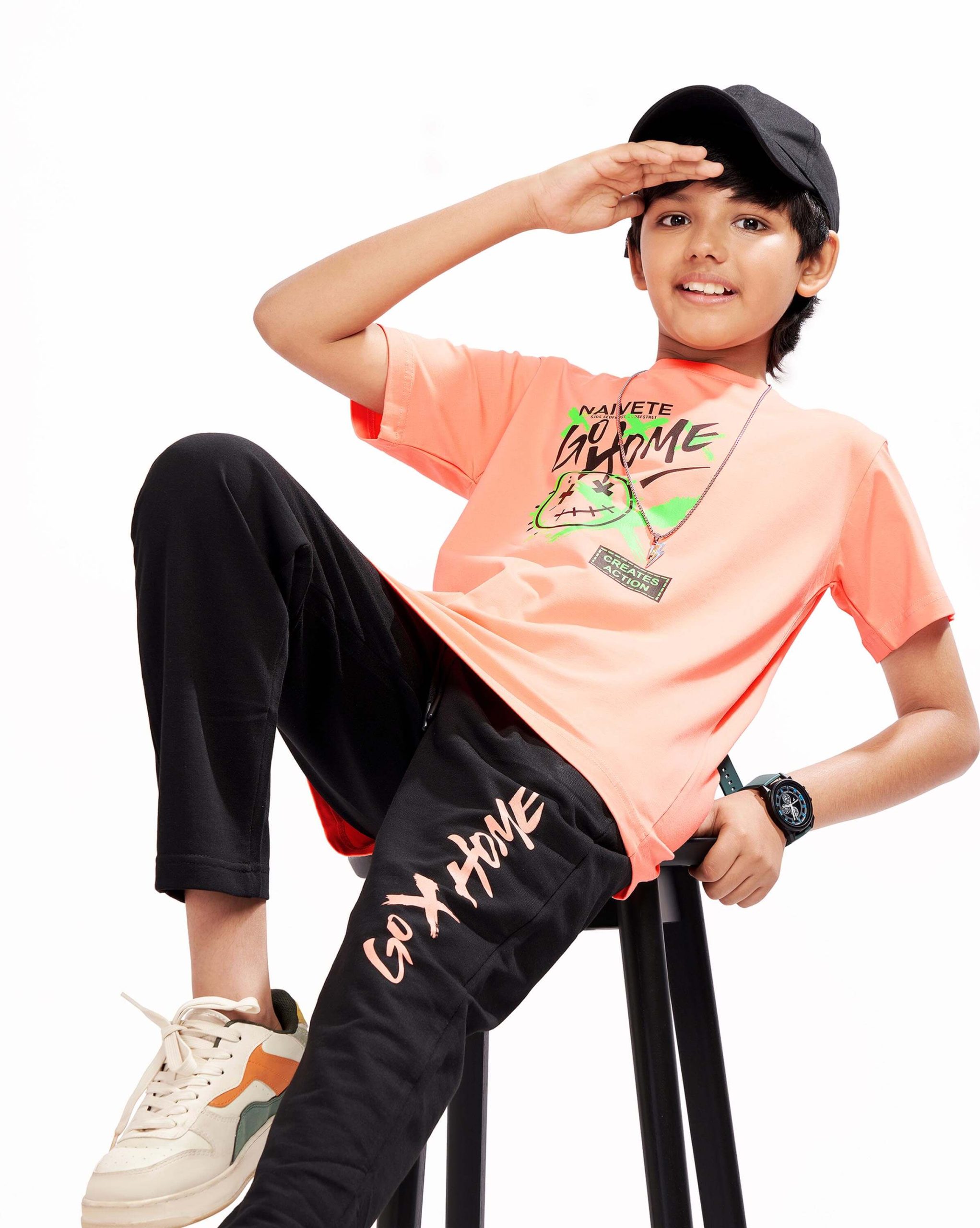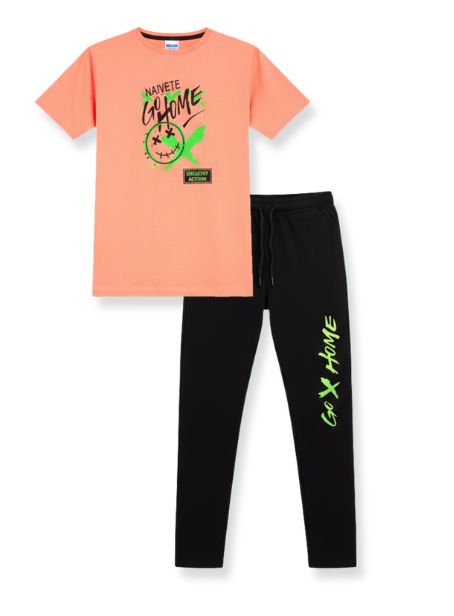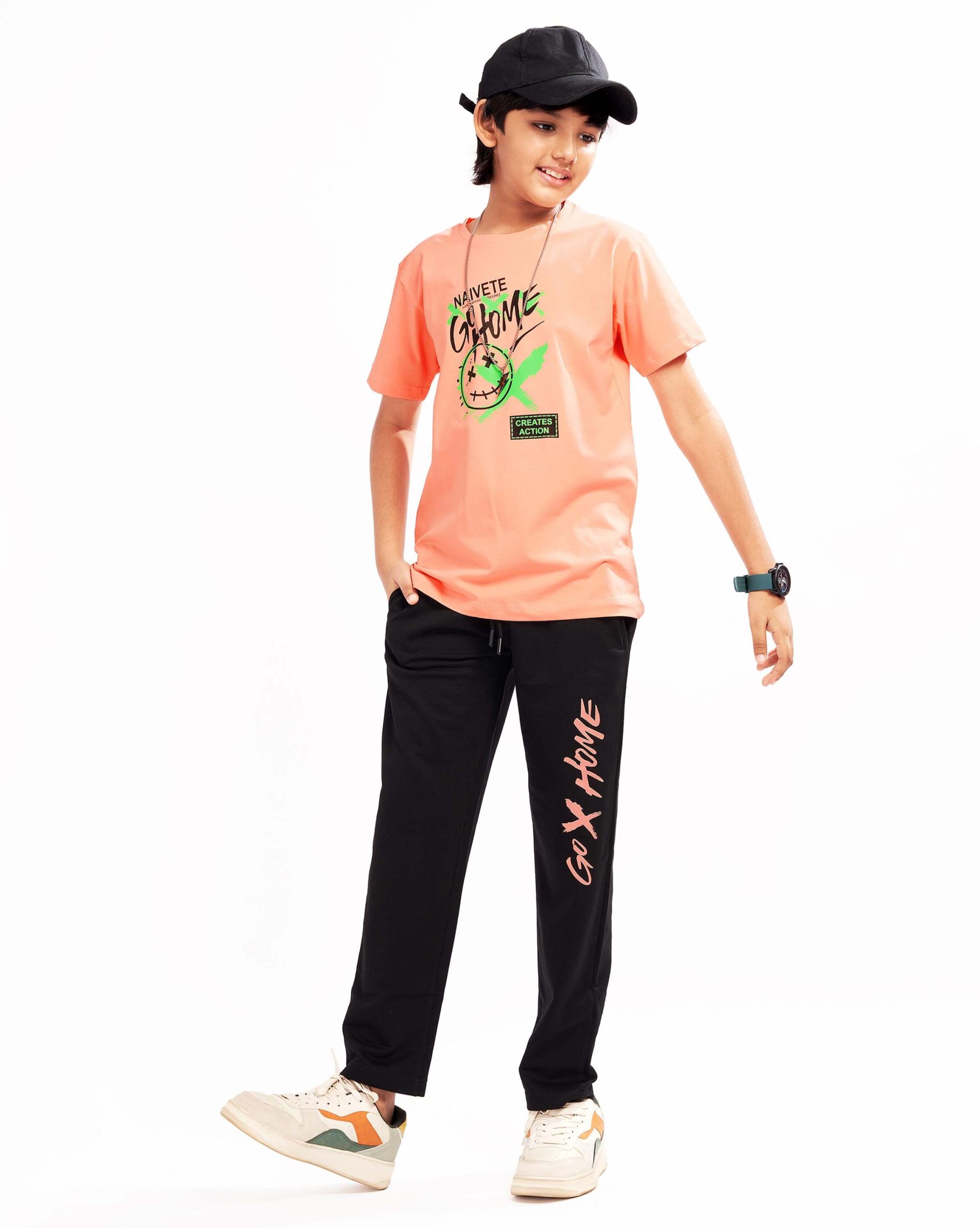 WEET Boys Cotton Pyjama Set with T-Shirt | Printed Nightsuit & Coord Set for Kids – Peach