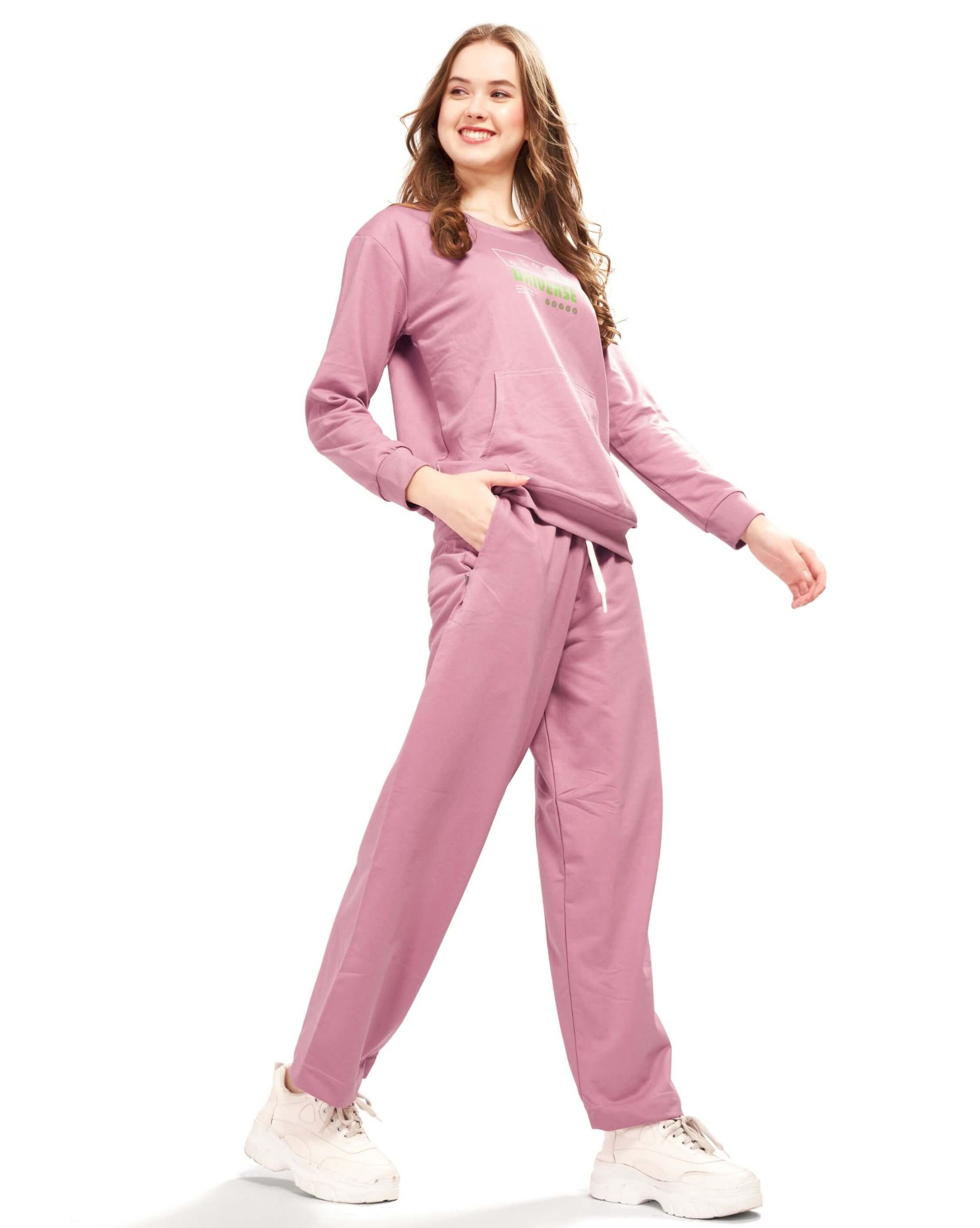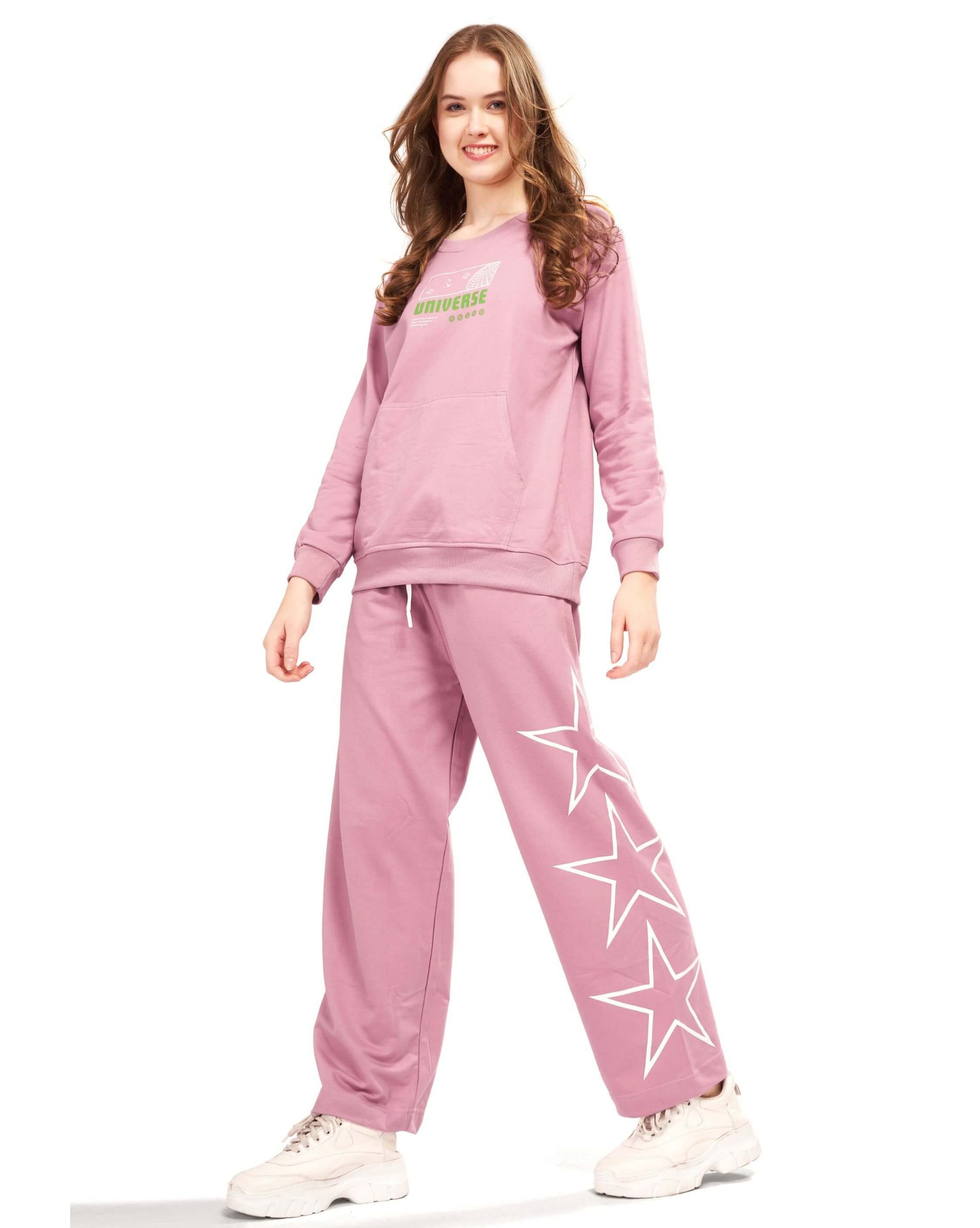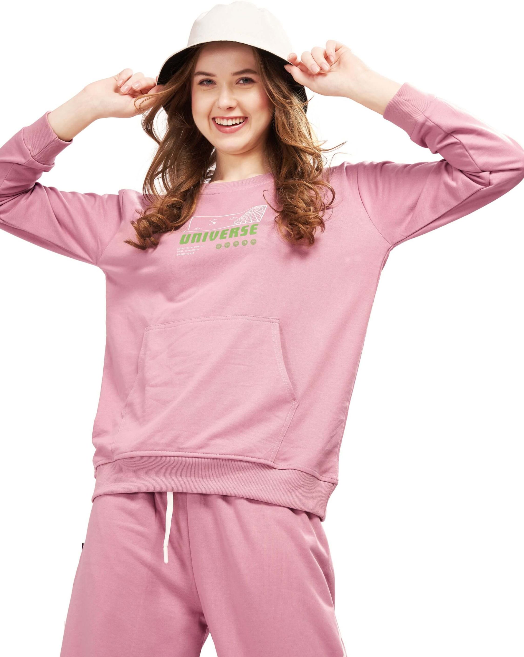 Upgrade your casual and activewear wardrobe with the WEET cotton full sleeves sweatshirt & joggers tracksuit. Crafted from soft, breathable cotton, this stylish co-ord set features a chest-printed sweatshirt with round neck and long sleeves, paired with mid-rise joggers designed with an elasticated waistband and side pockets for functionality. Perfect for jogging, workouts, gym sessions, travel, or lounging, this tracksuit keeps you comfortable without compromising on style. A versatile everyday outfit for women.