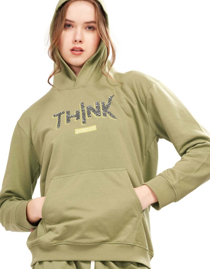 Sweatshirt: Chest-printed design with hooded neck & long sleeves