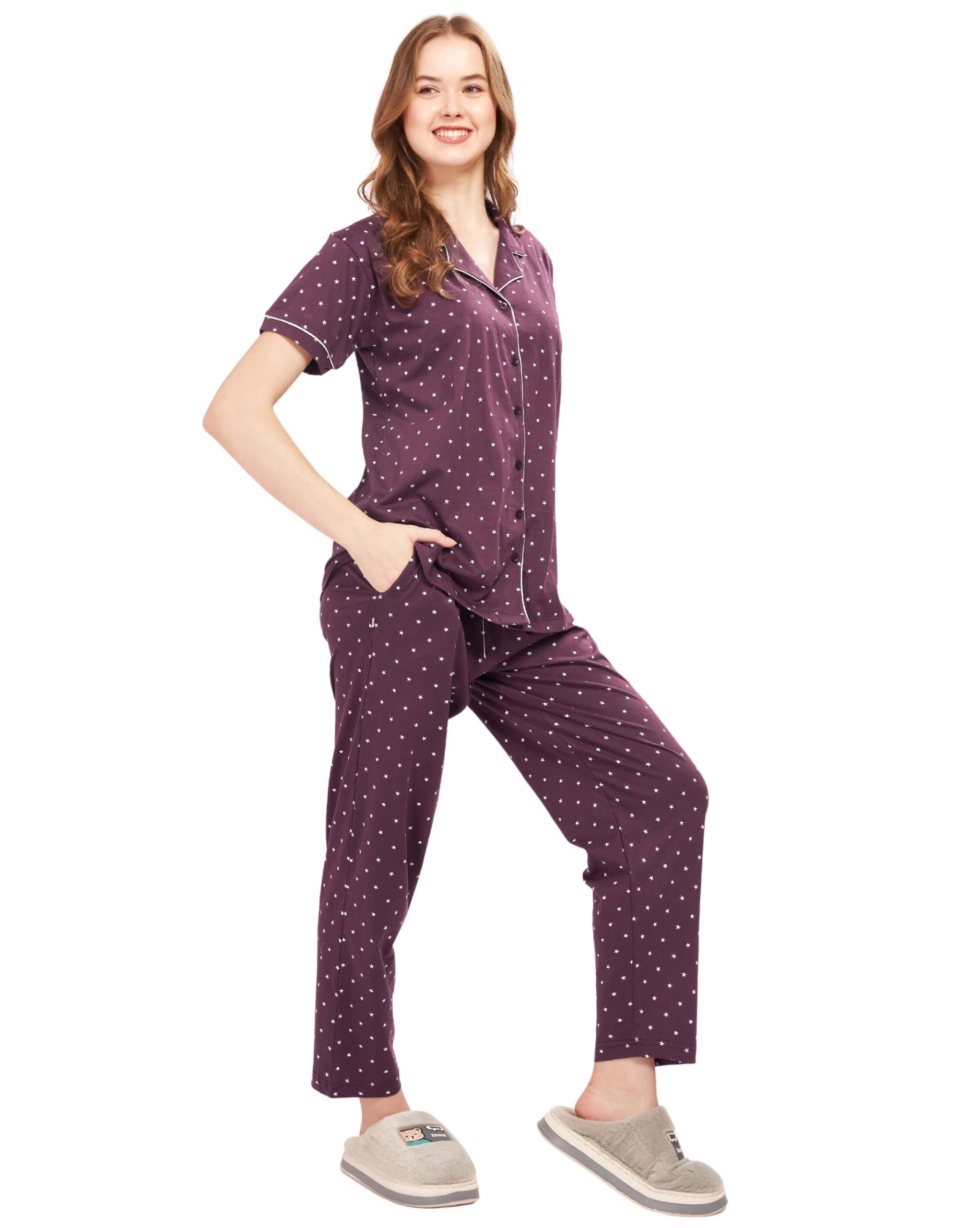 Discover the perfect blend of style and comfort with the WEET women’s shirt and pyjama set. Crafted from breathable cotton, this nightwear set includes a trendy notched collar shirt with half sleeves paired with matching pyjama pants featuring an elastic waistband. Whether you’re unwinding after a long day or lounging on a weekend, this women’s pyjama set ensures cozy comfort and a fashionable touch. Ideal as a ladies’ nightsuit for everyday sleepwear, travel, or casual home wear, it makes a stylish upgrade to your nightwear collection.