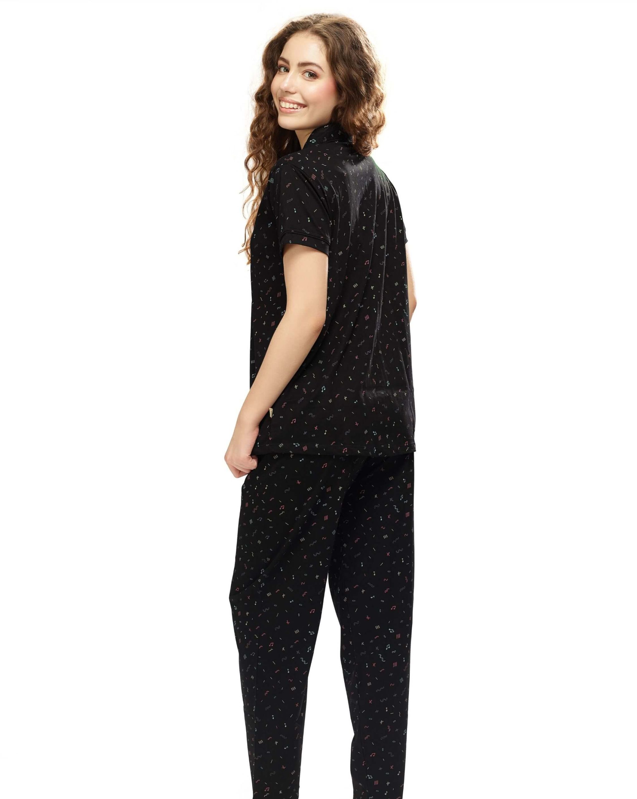 The WEET Night Suit for Women in Black with a Music Party design adds fun and comfort to your loungewear collection. Made from soft cotton, this night dress of shirt and pyjama set is perfect for a relaxing evening or a cozy nightâs sleep. The playful music-themed print brings a touch of personality and excitement to your sleepwear, making it a stylish choice for lounging or resting at home. Enjoy both comfort and style with this eye-catching, fun set.