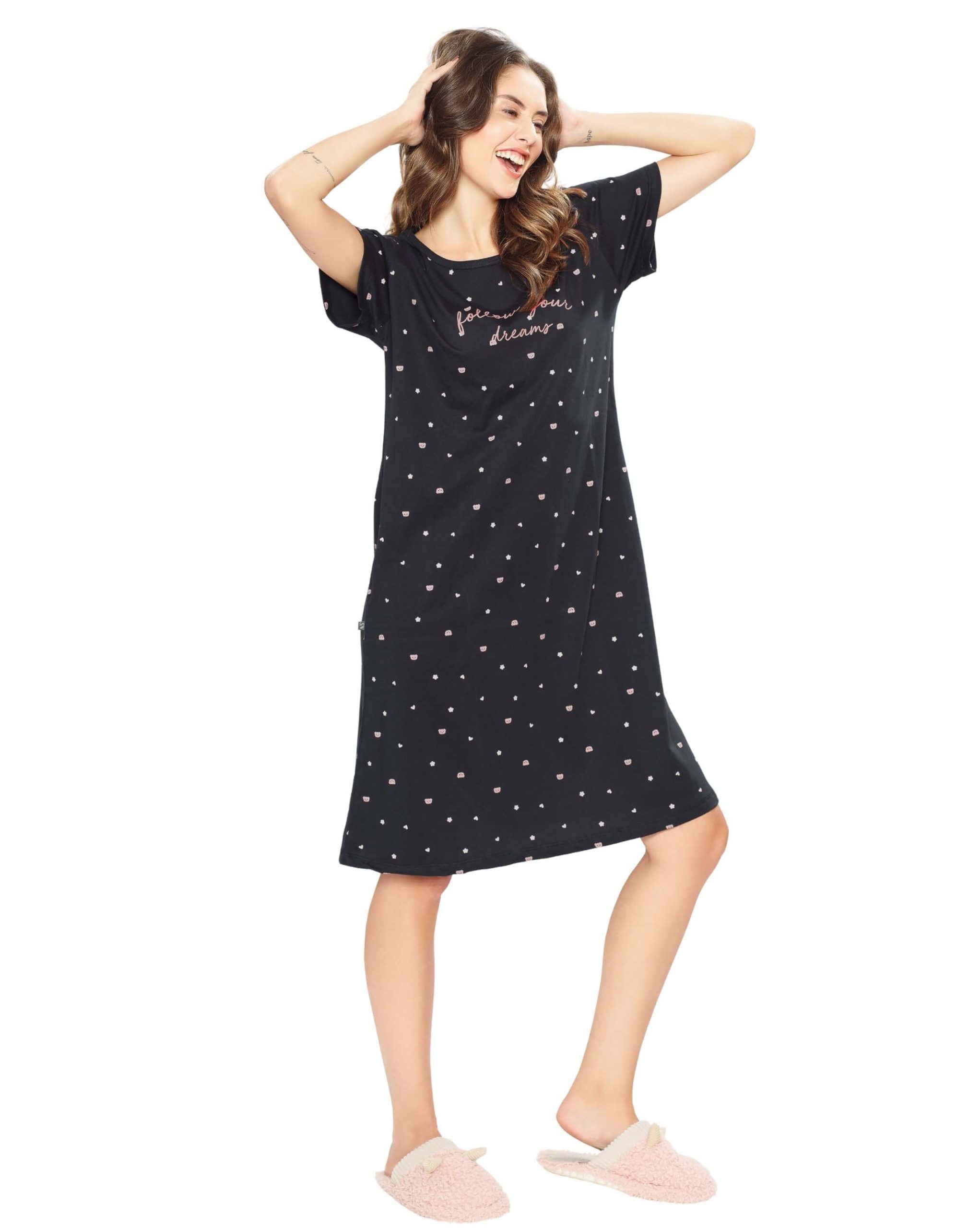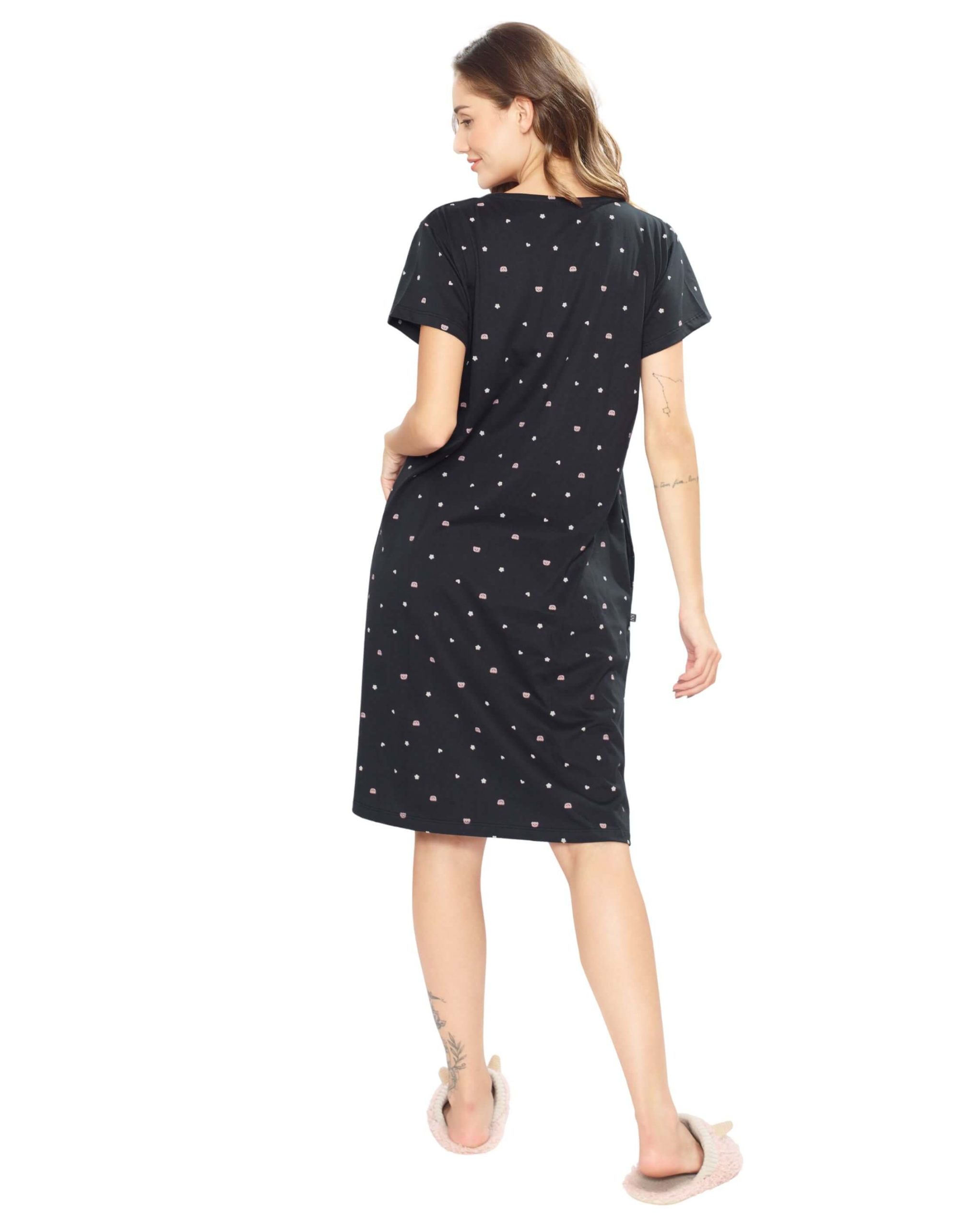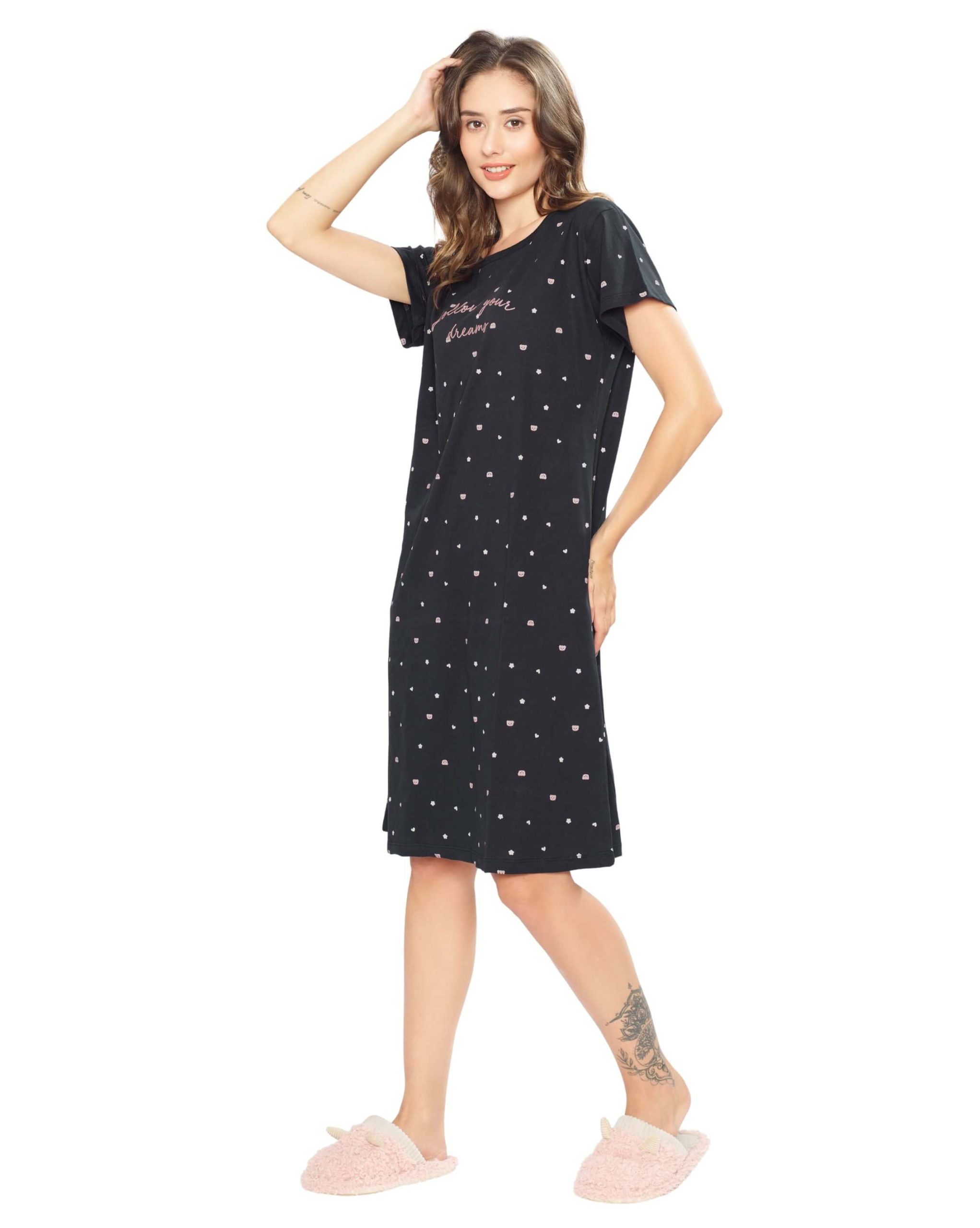 Upgrade your nightwear collection with the Women’s Black Printed Short Nighty. This elegant black nighty, made from breathable, high-quality fabric, combines style and comfort effortlessly. Featuring a trendy printed design, it’s perfect for a cozy night’s sleep or relaxed evenings at home. Available in multiple sizes to fit every womanâs needs.