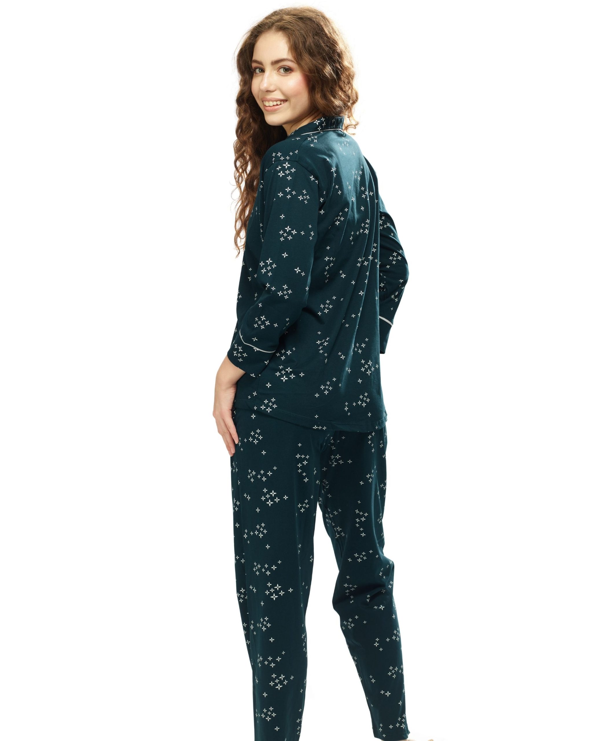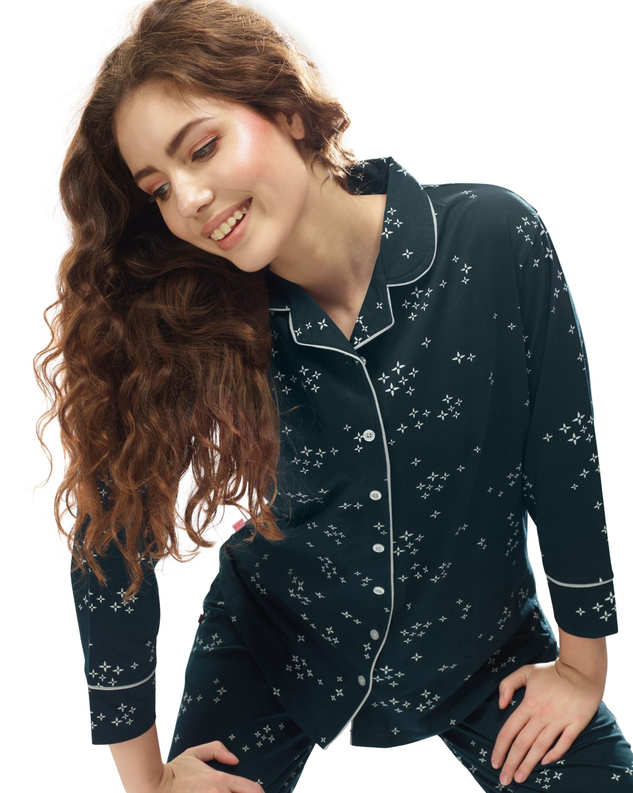 The WEET Night Suit for Women in Dark Green offers the perfect blend of style and comfort. Crafted from soft cotton, this night dress of shirt and pyjama set is ideal for relaxing, lounging, or a restful night’s sleep. Stay chic and cozy with this timeless, stylish set.