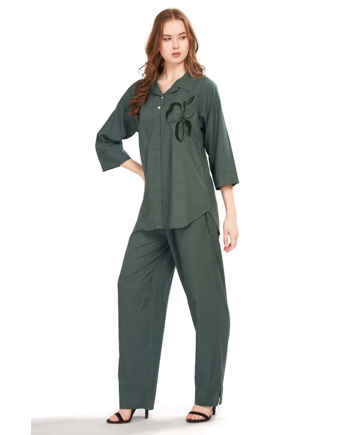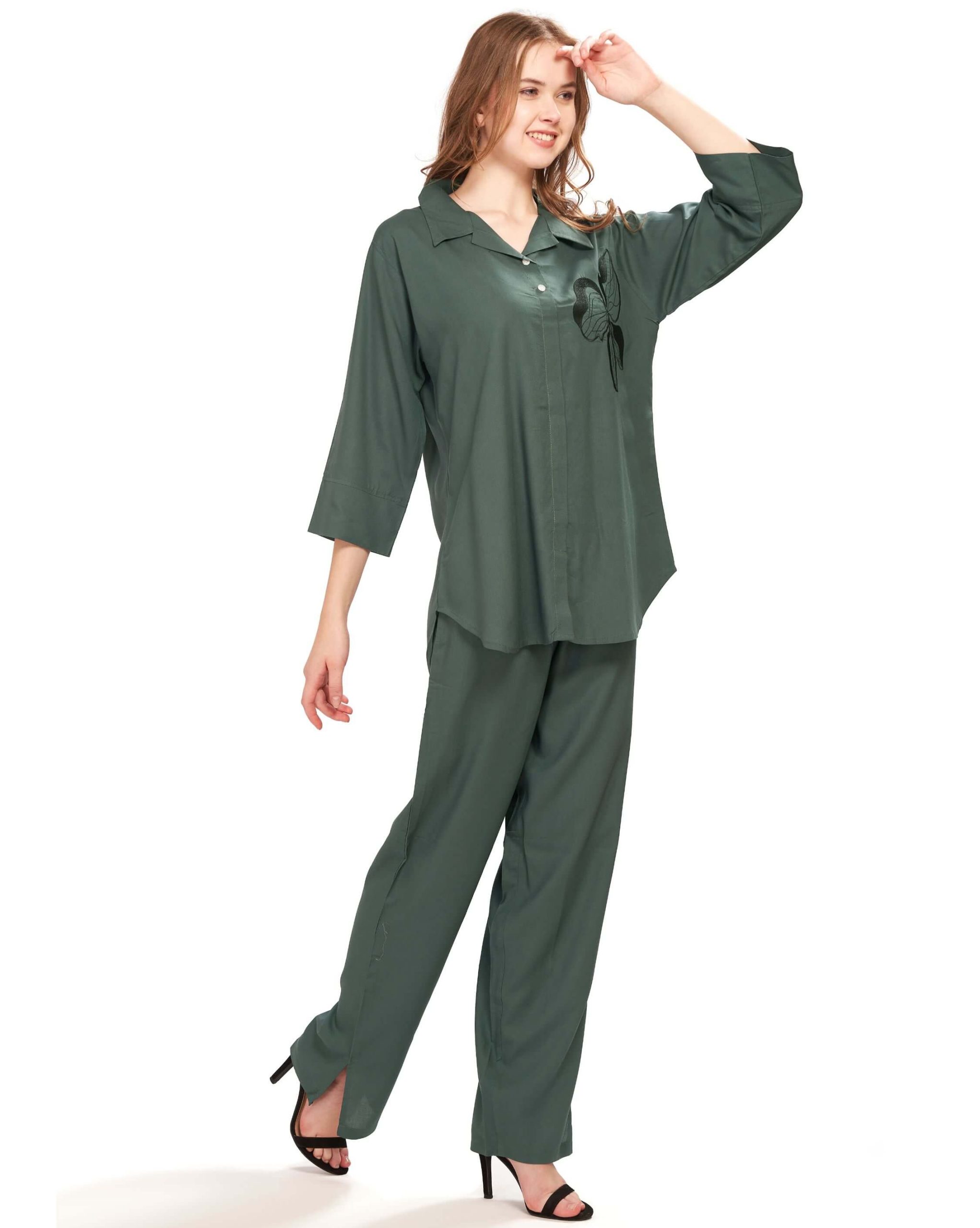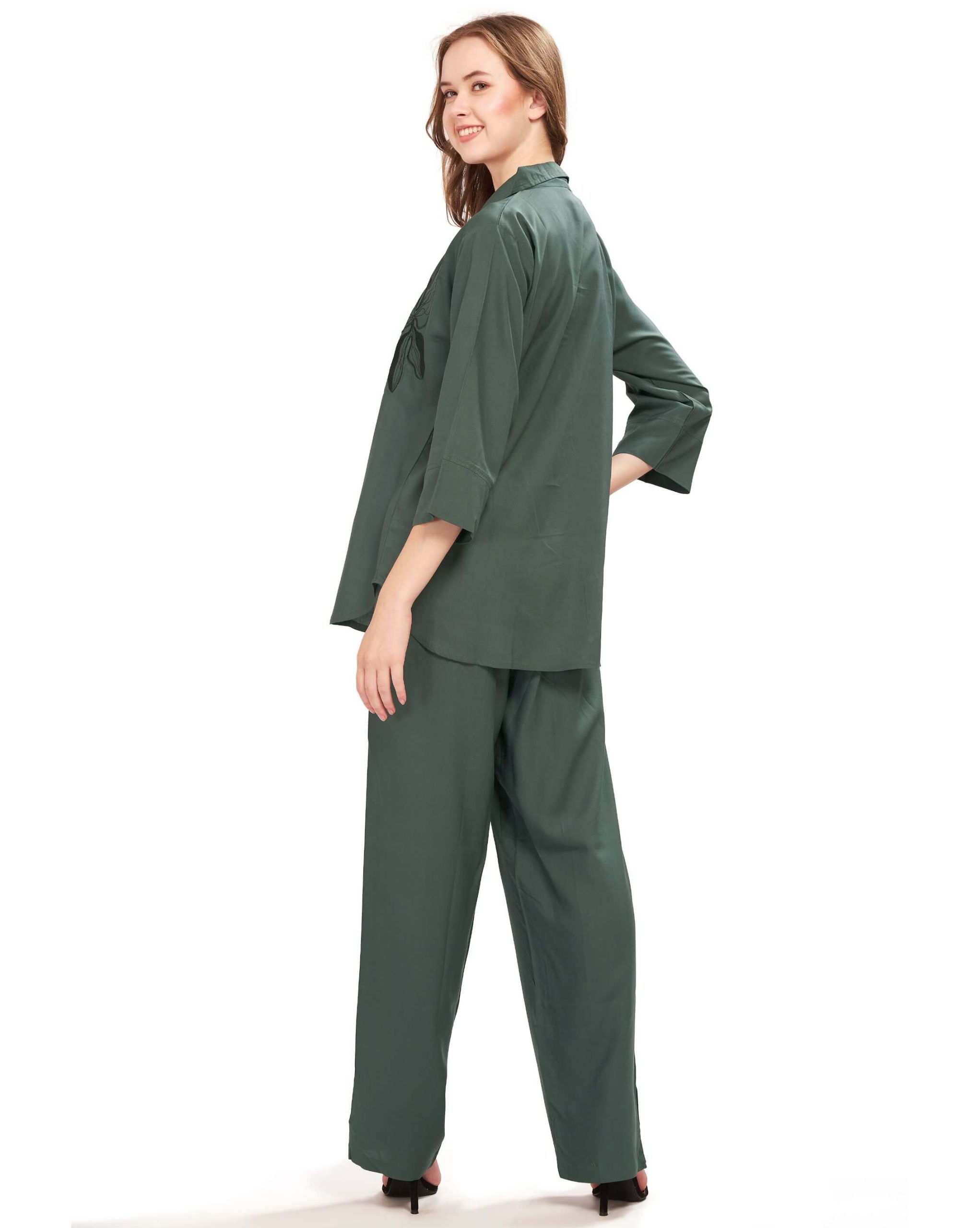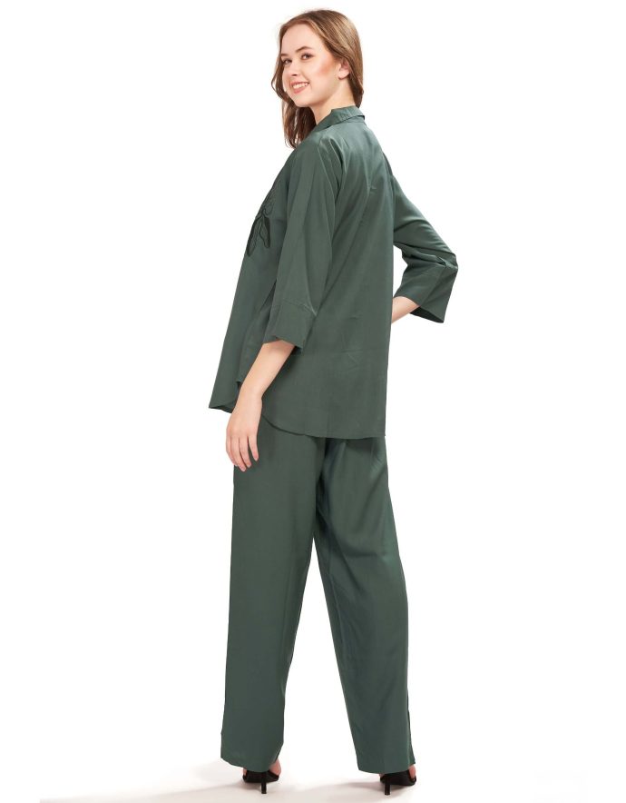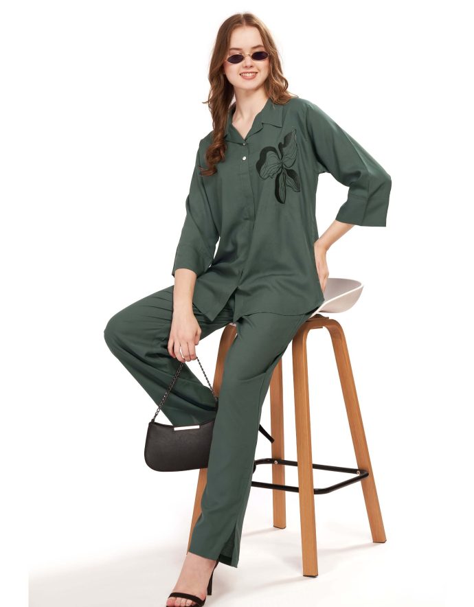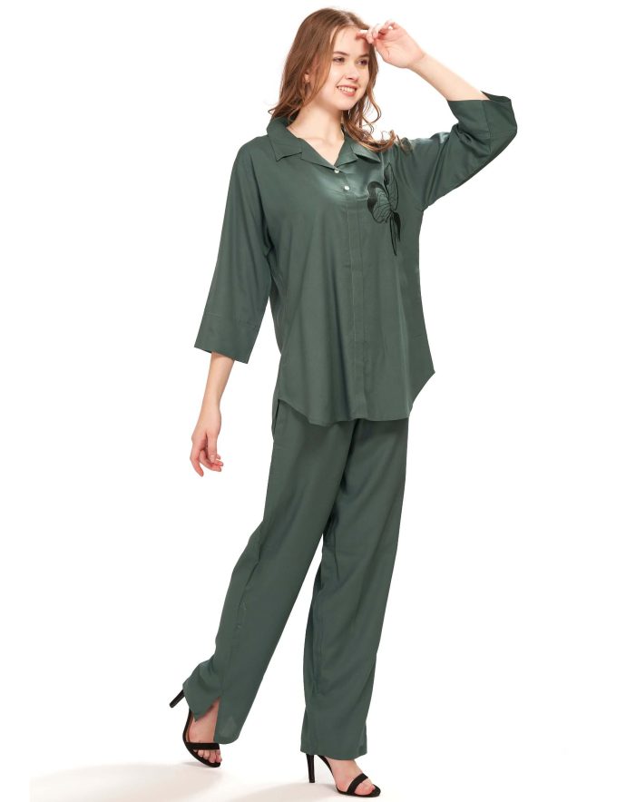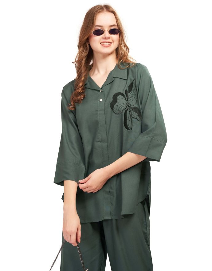 Women’s Embroidered Rayon Co-ord Set – Short Kurti Collar Top & Bottom with Pockets – Dark Green