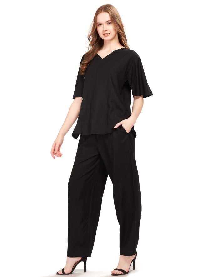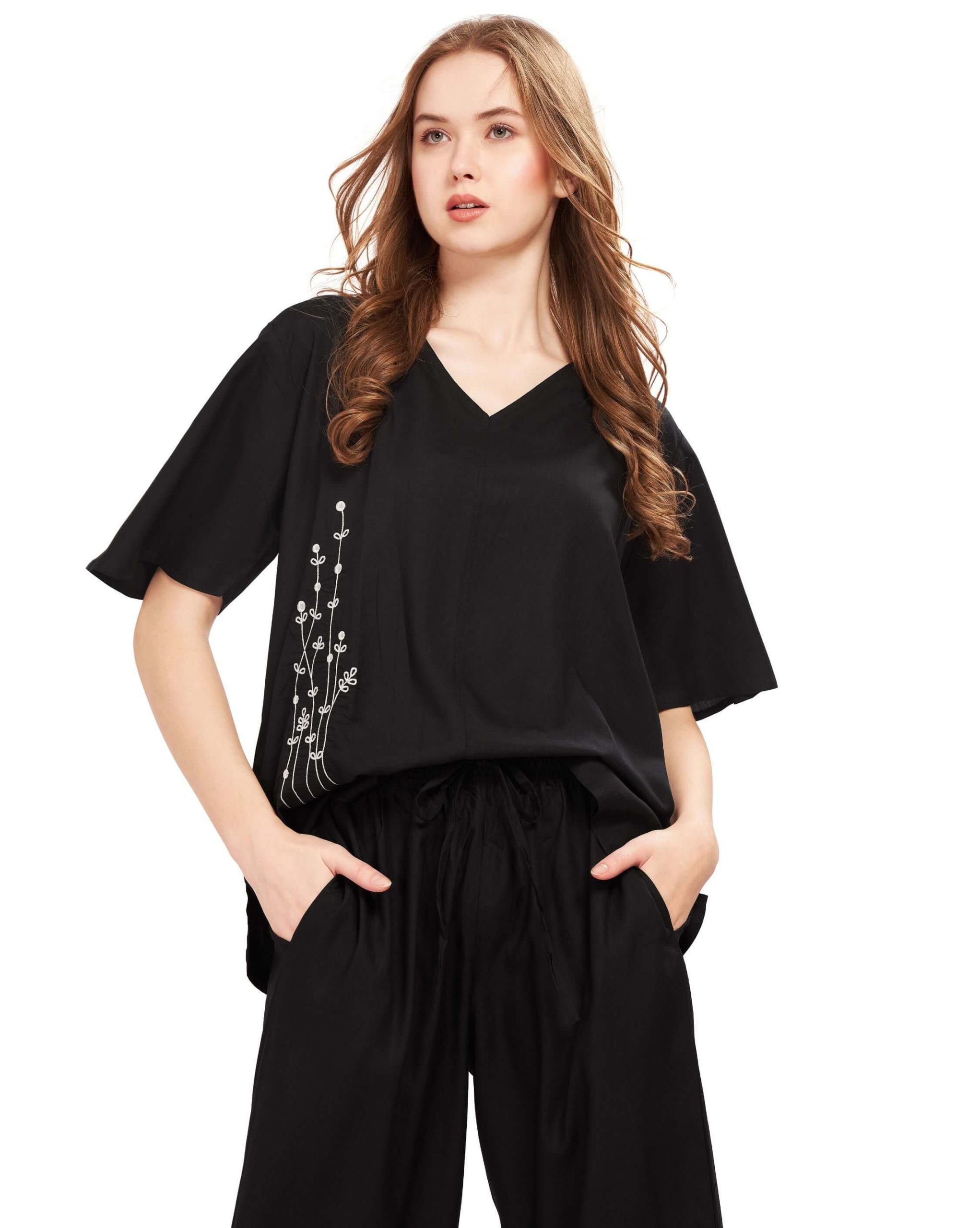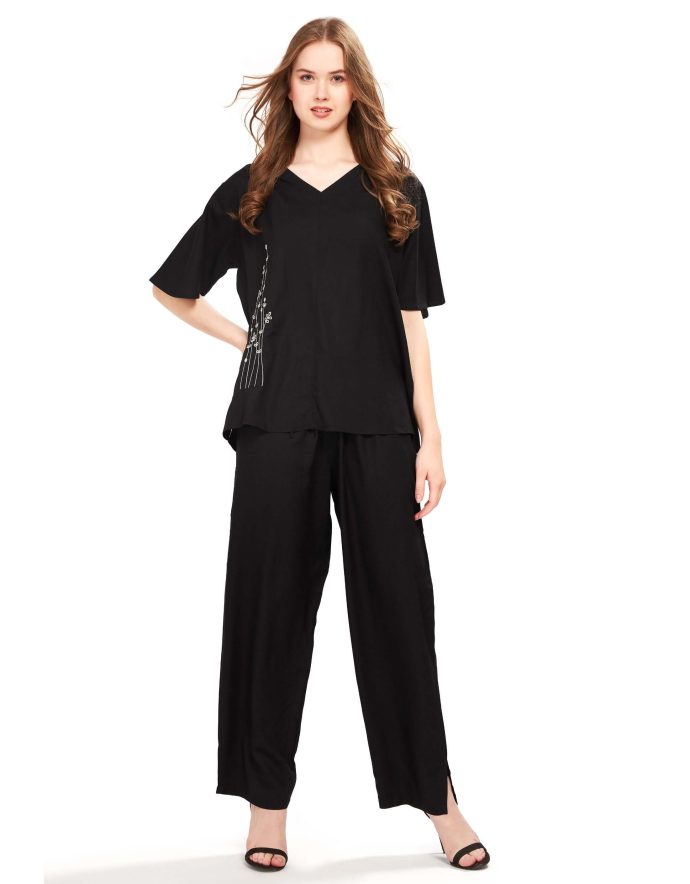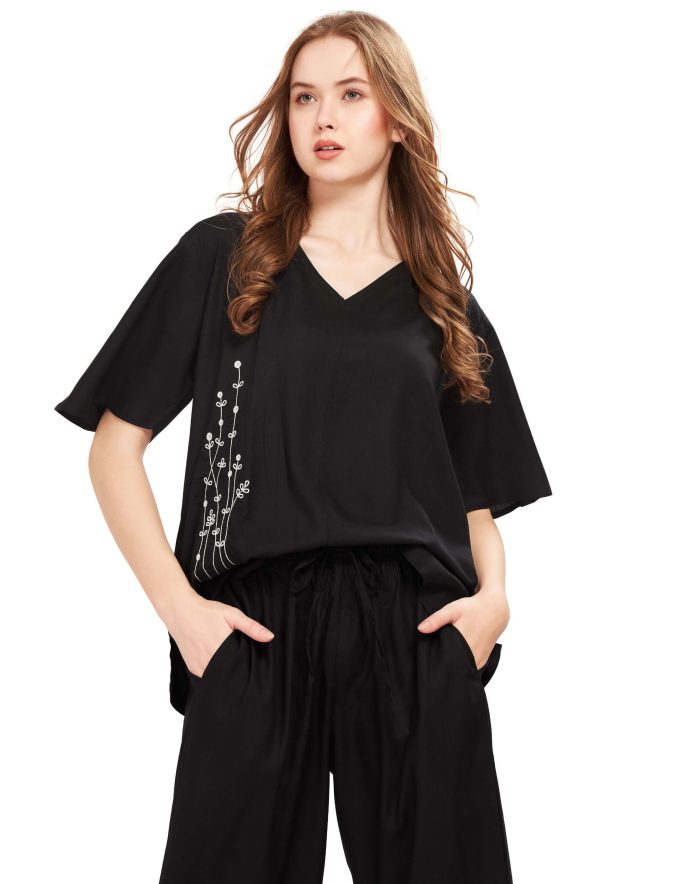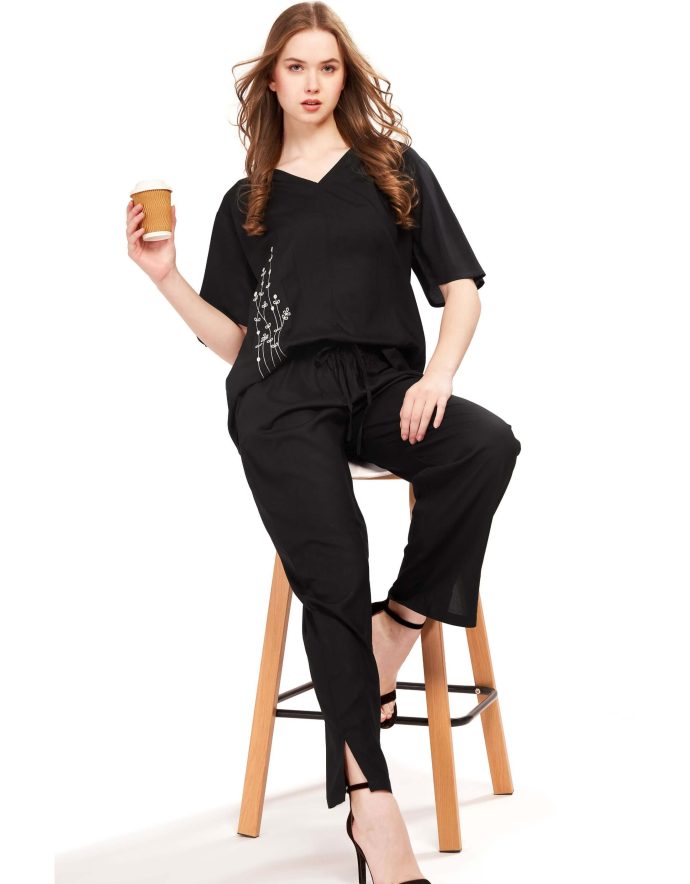 Women’s Embroidered Rayon Co-ord Set – V-Neck Top & Bottom with Pockets – Black