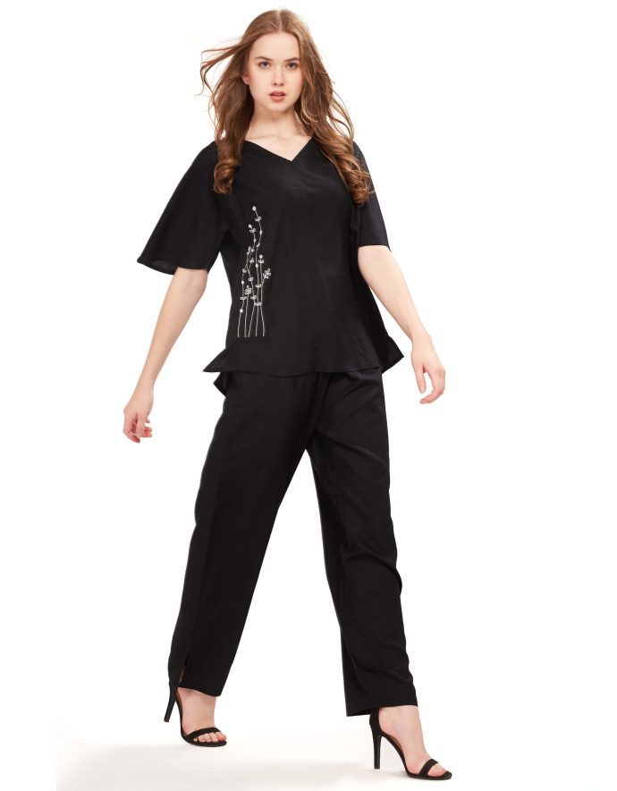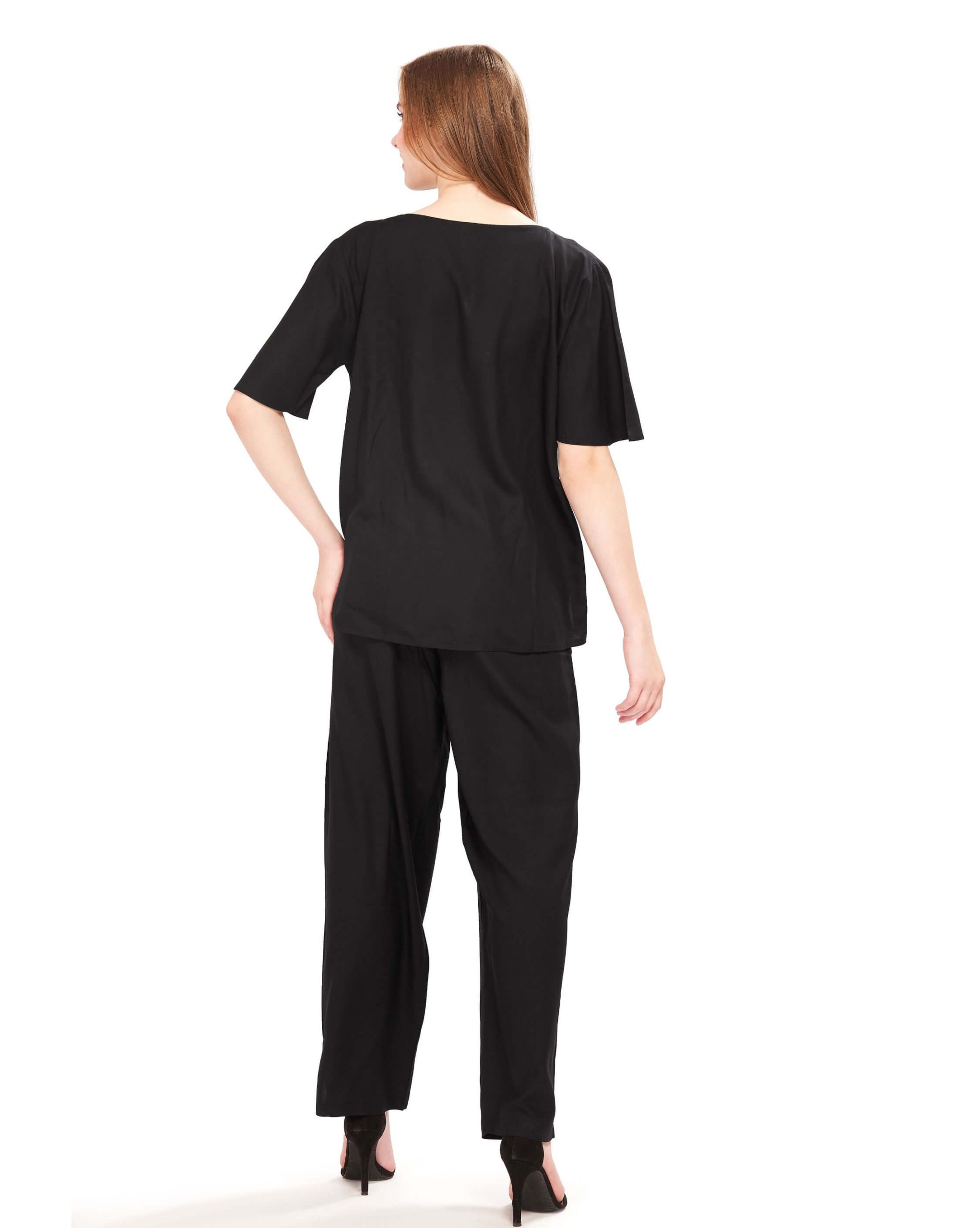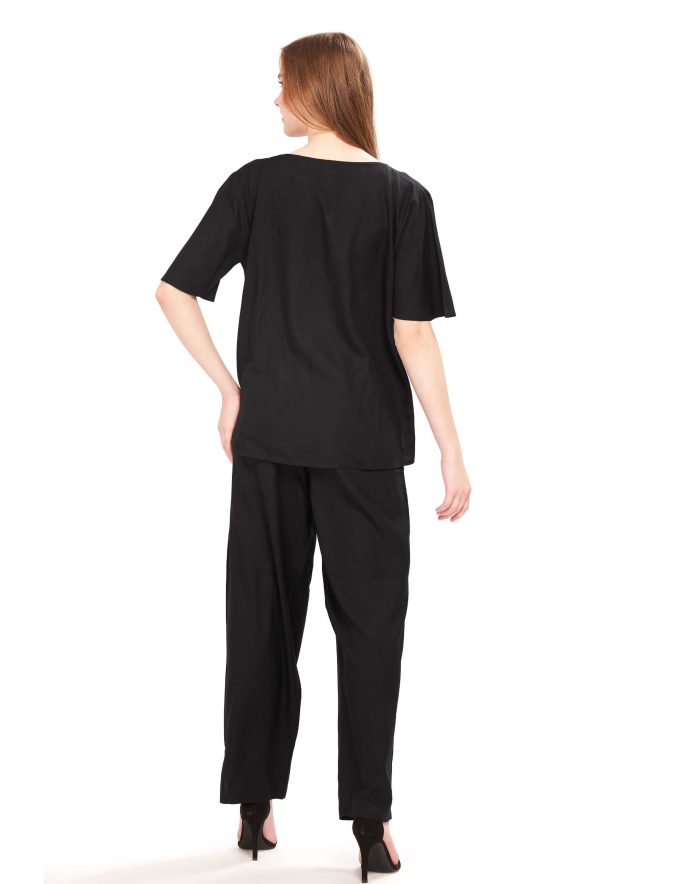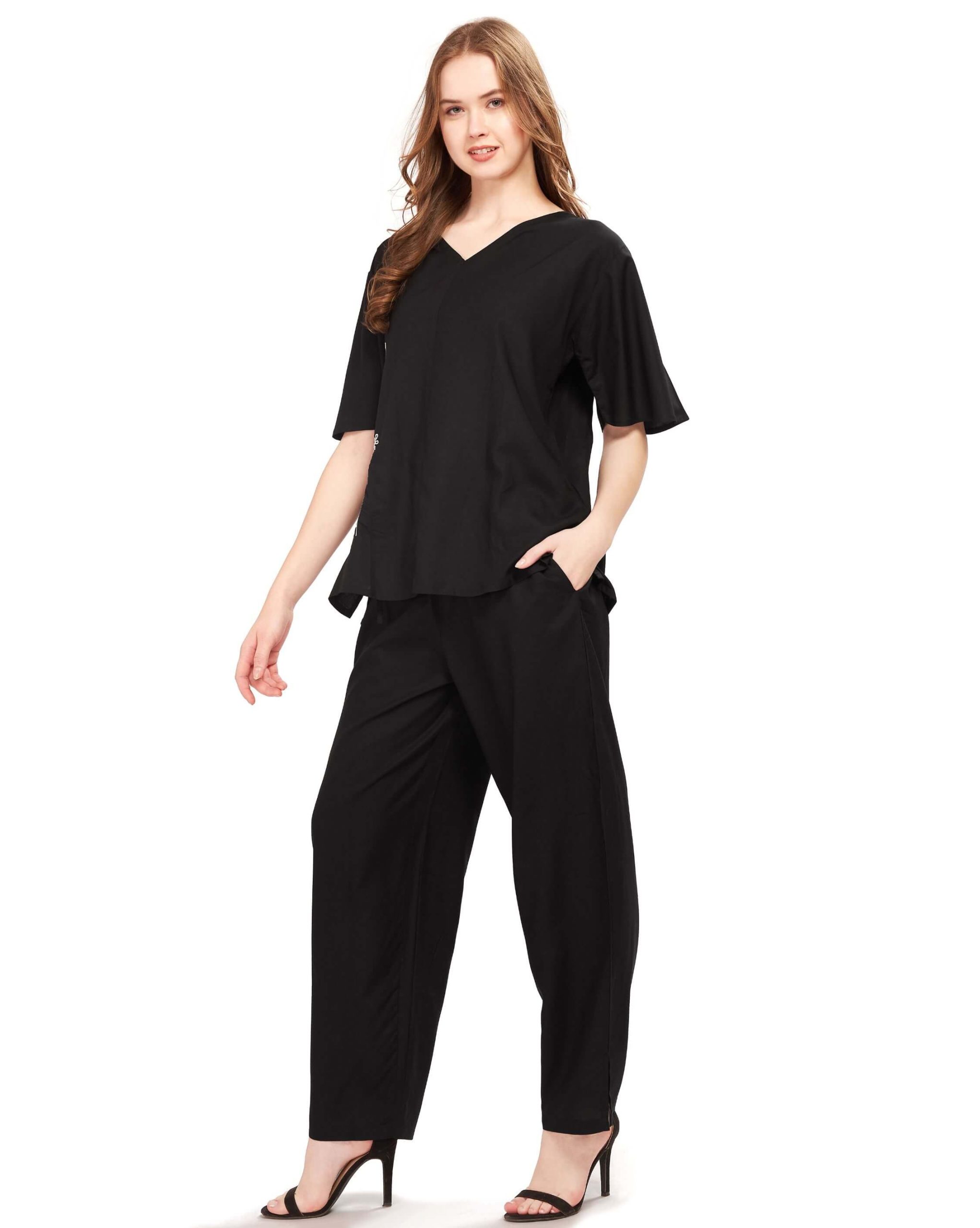 Women’s Embroidered Rayon Co-ord Set – V-Neck Top & Bottom with Pockets – Black