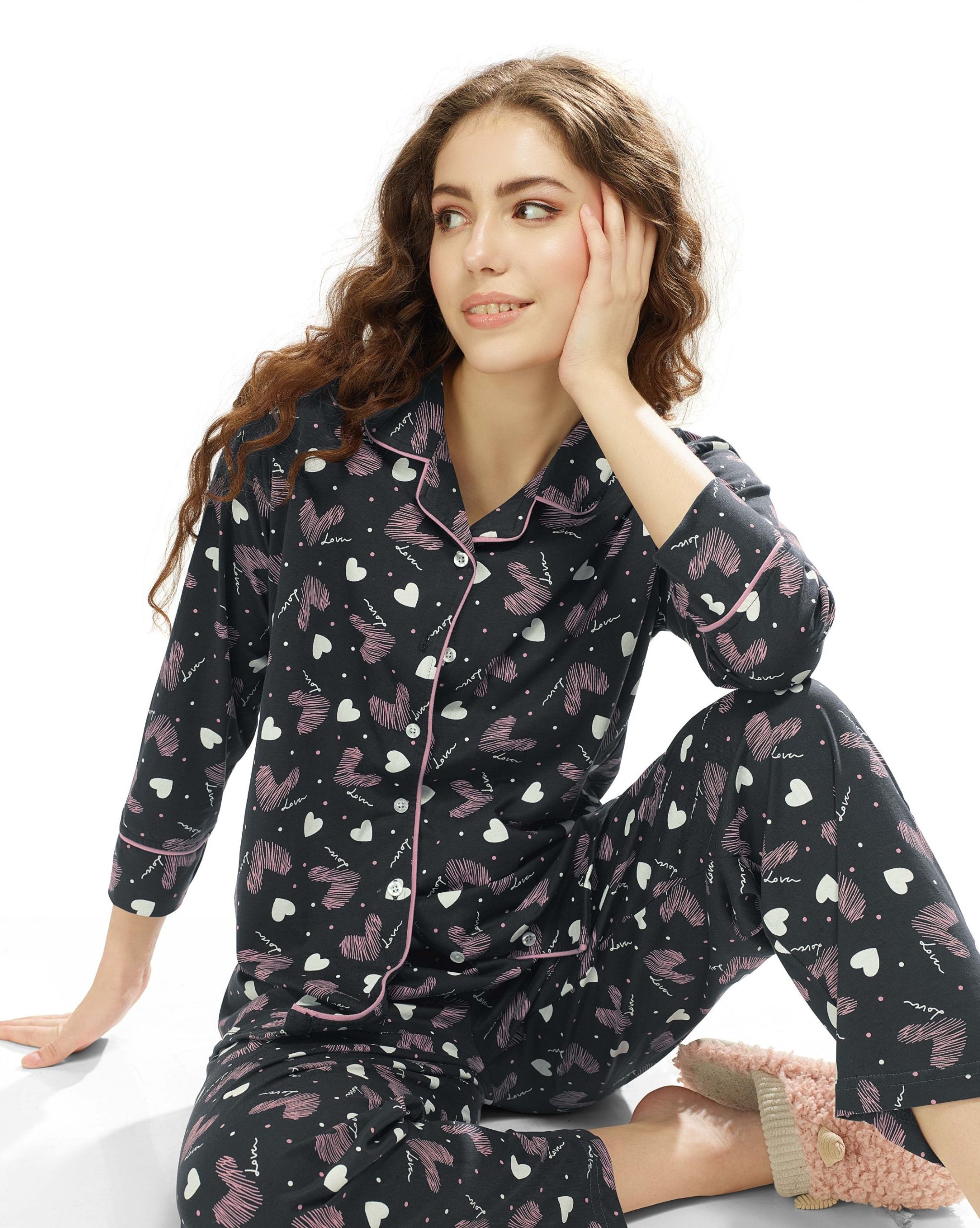The WEET Night Suit for Women featuring a heart print brings together comfort and charm. Made with soft cotton, this night dress of shirt and pyjama set is perfect for a restful nightâs sleep or cozy lounging at home. Embrace both style and comfort with this adorable heart-printed set.
