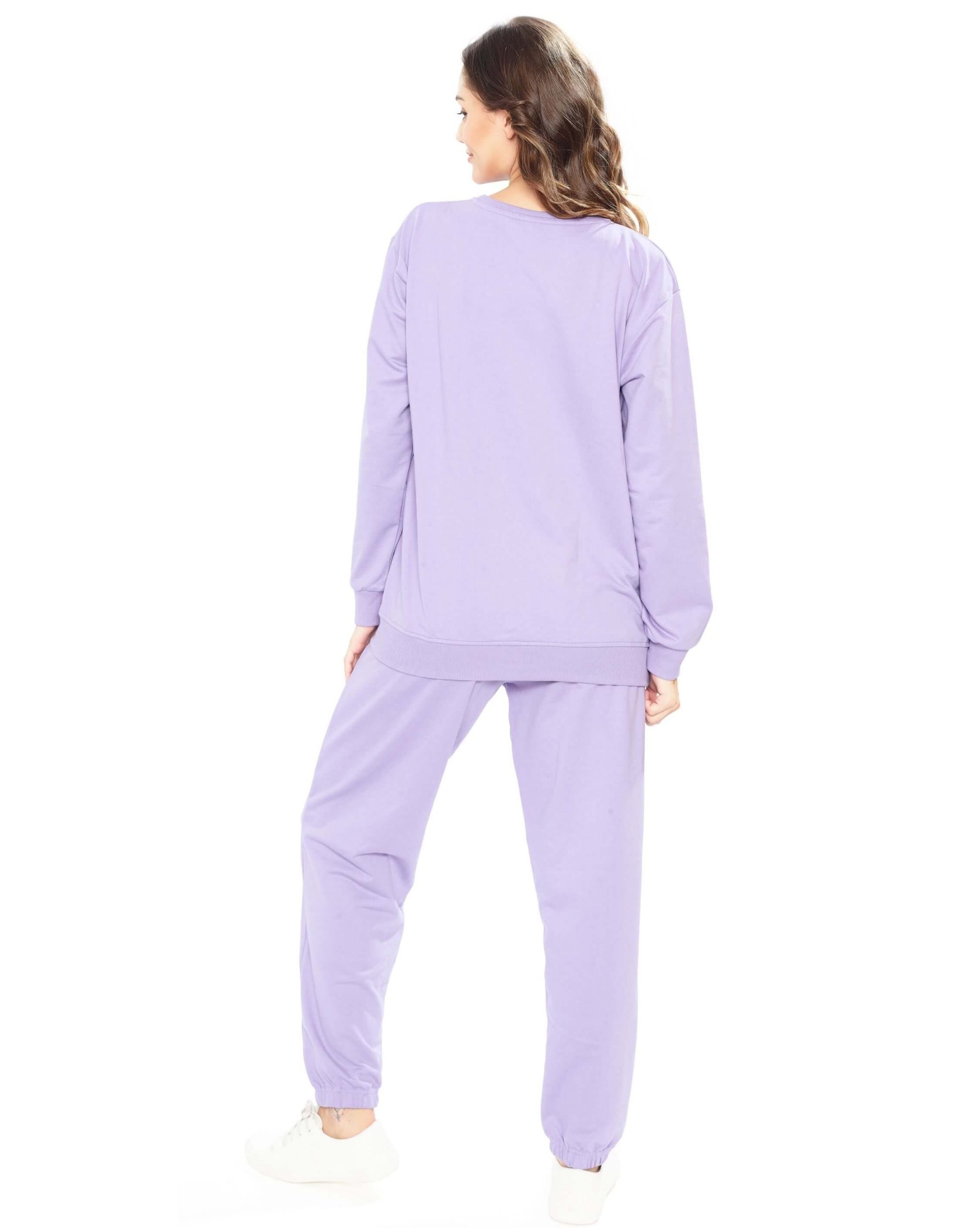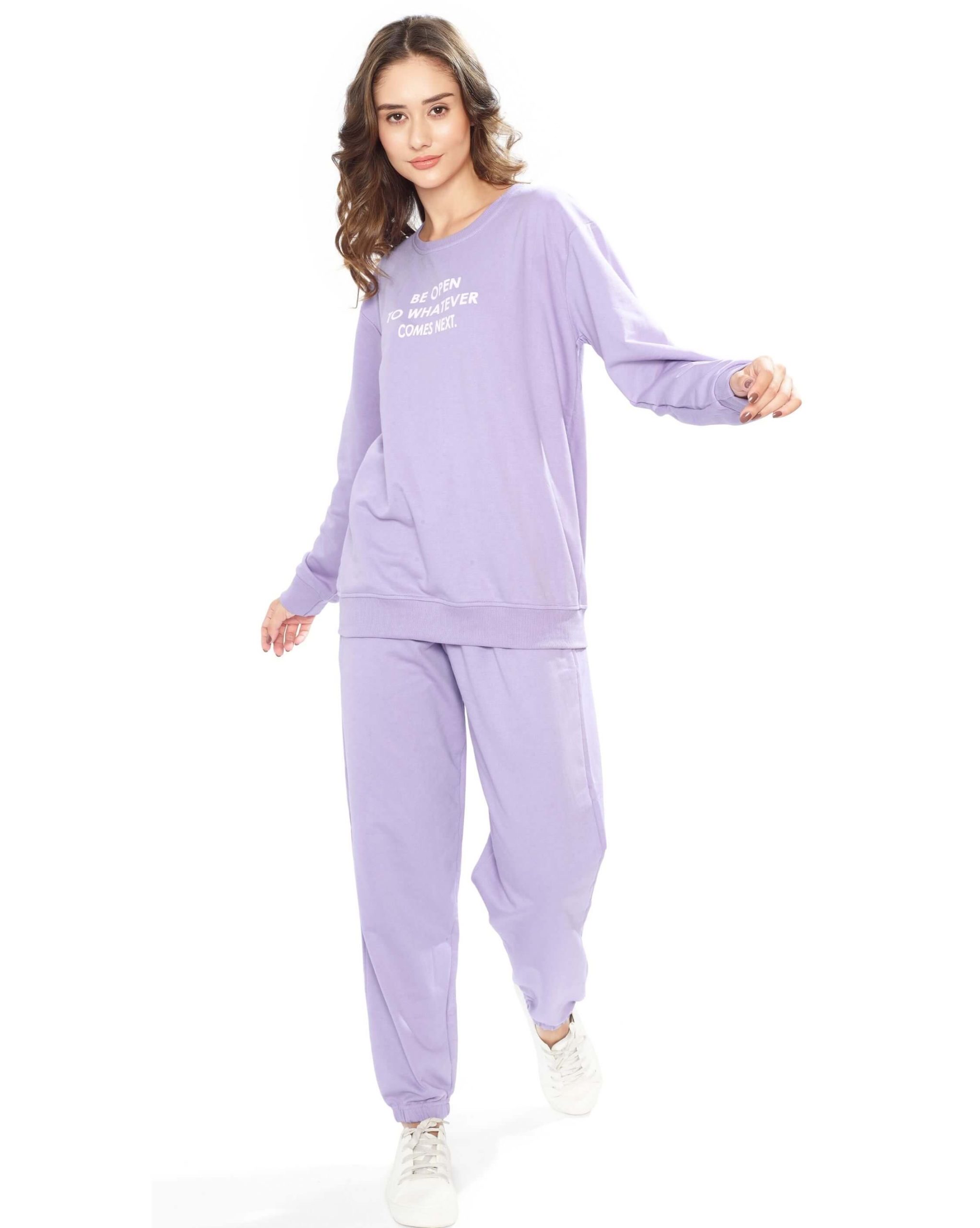Add a pop of soft color to your wardrobe with the Weet Women’s Lavender Full-Sleeve Tracksuit. Designed for a relaxed yet fashionable look, this joggers and t-shirt womens set features a cozy sweatshirt paired with matching joggers for all-day comfort. Whether you’re heading out for errands, relaxing at home, or styling up for a casual day out, this top and jogger set for ladies is your go-to choice.