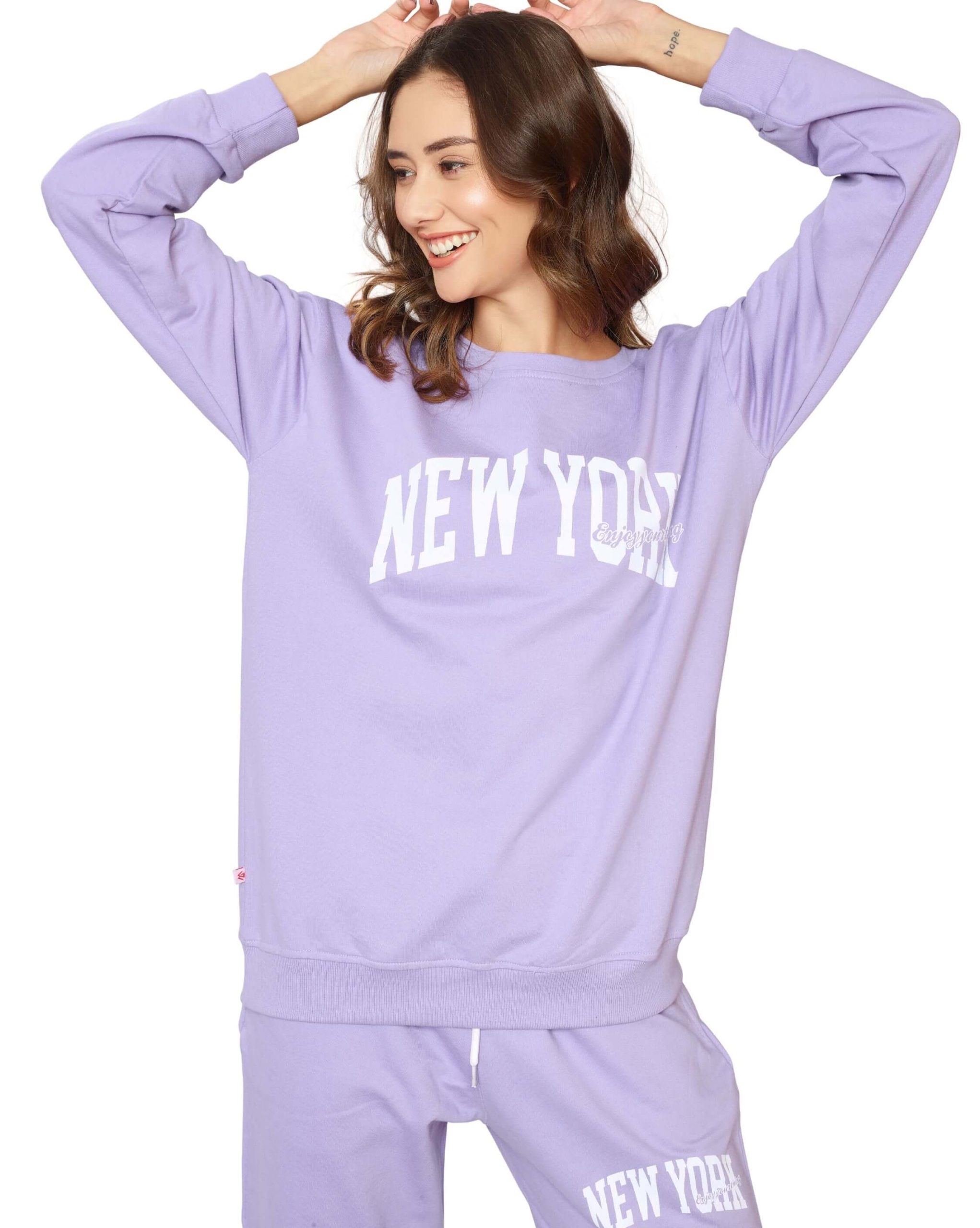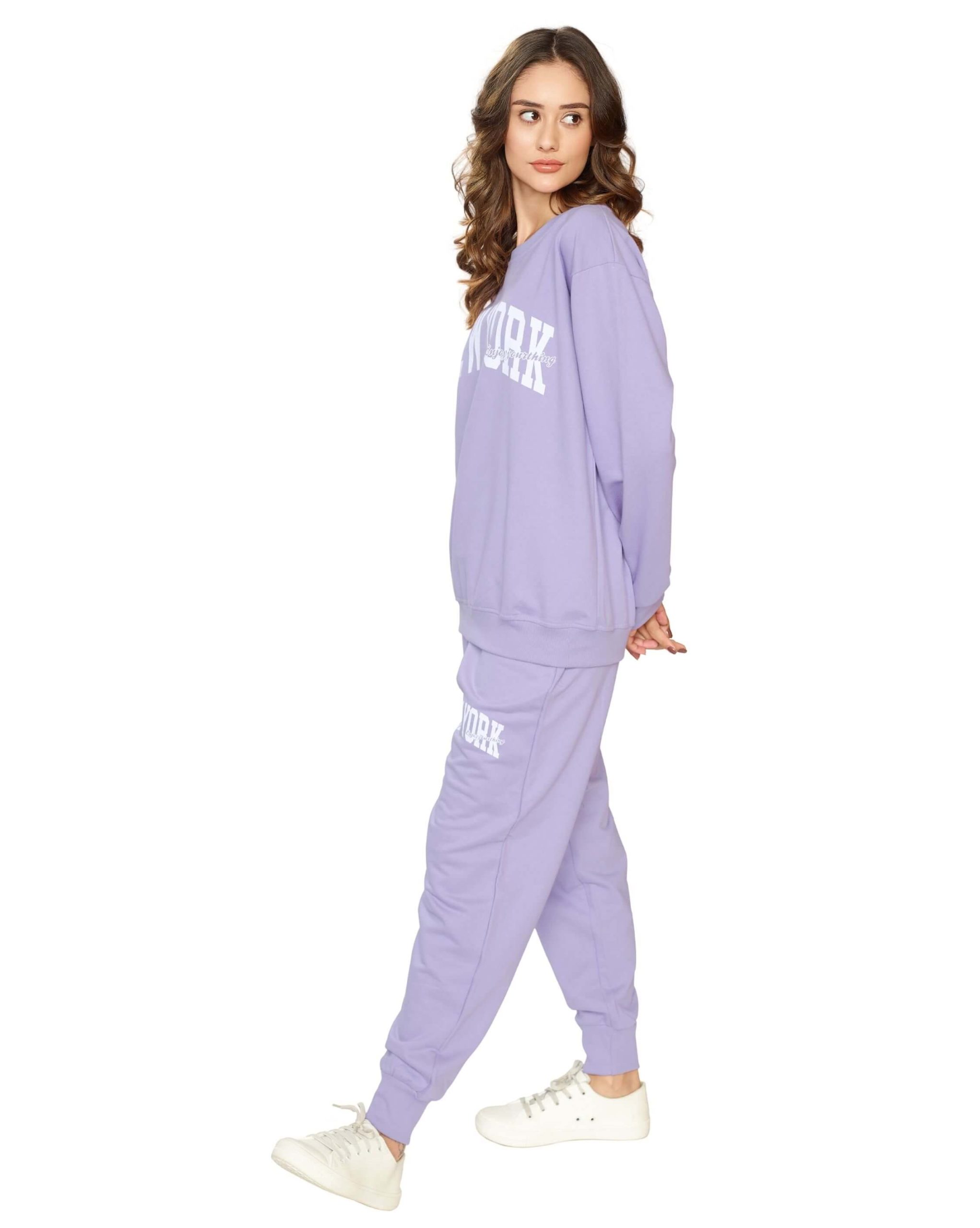 Upgrade your travel and lounge wardrobe with the Weet Women’s Lavender “New York” Sweatshirt and Joggers Tracksuit. This full-sleeve tracksuit is made from ultra-soft, breathable fabric, ensuring all-day comfort. The trendy “New York” print sweatshirt adds a chic urban vibe, while the matching joggers offer a snug yet flexible fit. Whether you’re traveling, running errands, or just relaxing at home, this lavender tracksuit is a must-have for effortless style and comfort. Pair it with sneakers for a sporty look or layer it up for a cozy winter outfit!