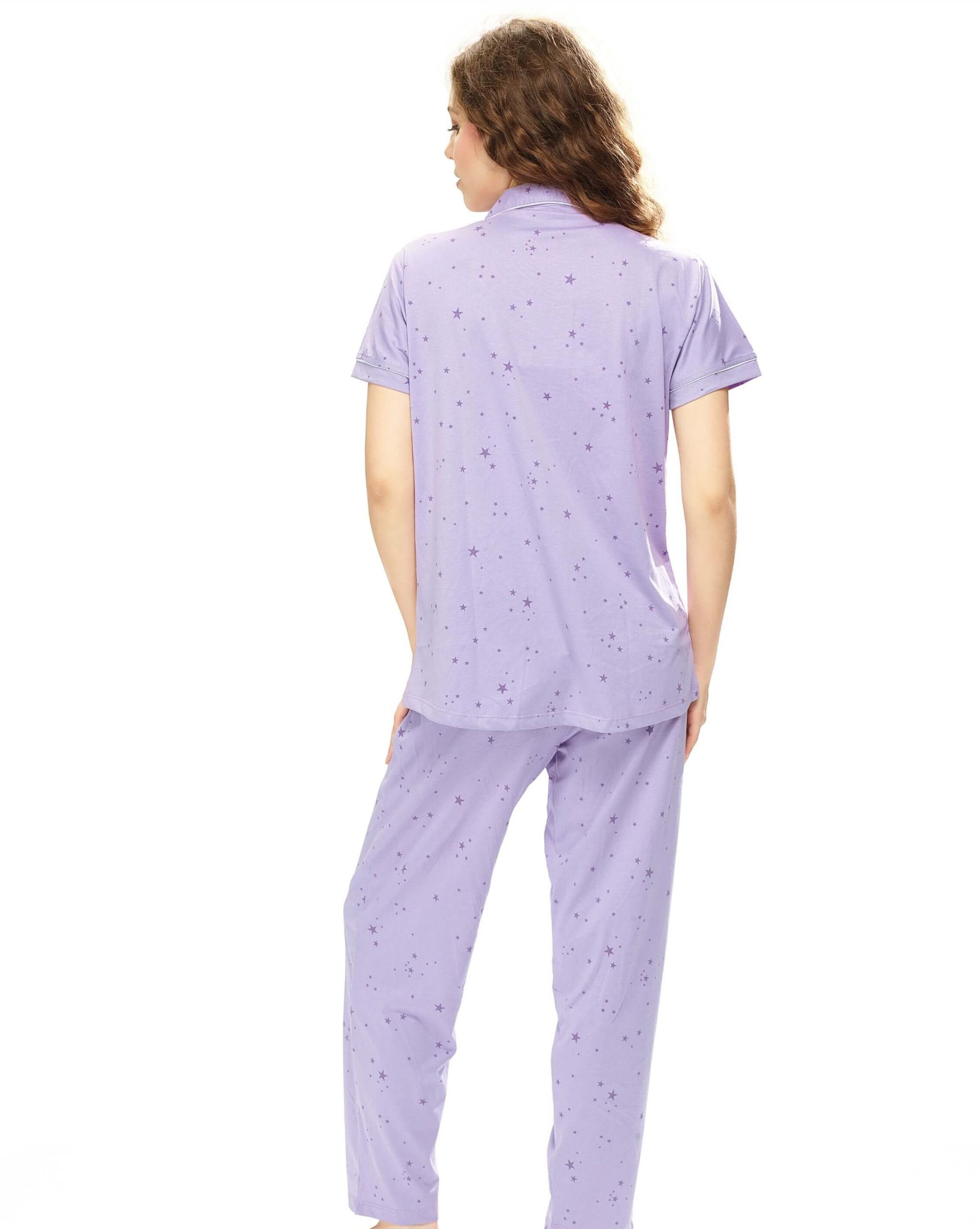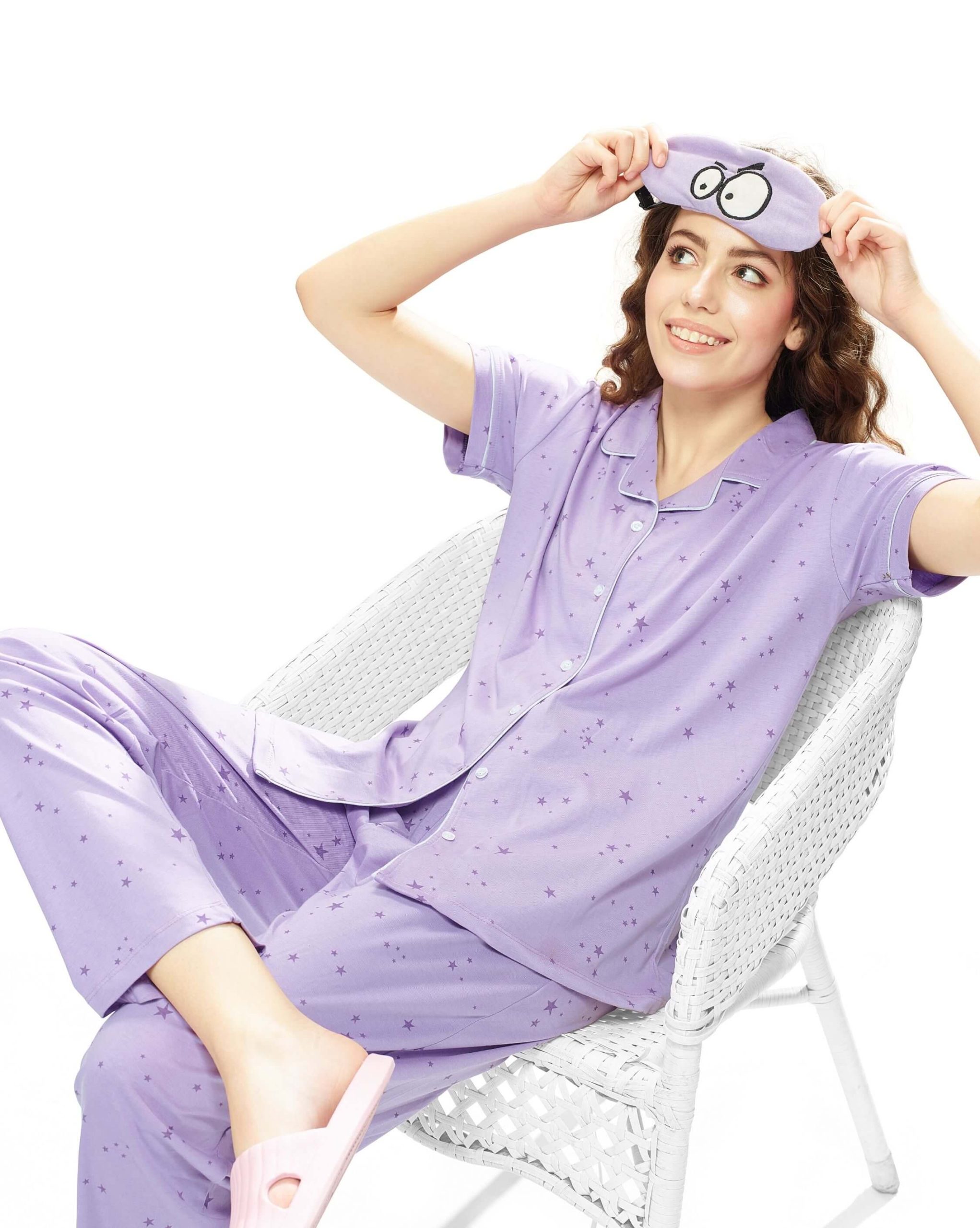 Unwind in style with the Weet Women’s Cotton Lavender Star Printed Night Suit Set. Crafted from premium cotton fabric, this women’s nightwear set ensures breathability and all-night comfort. The soothing lavender shade with charming star prints adds a touch of elegance. Featuring a button-down shirt and elastic waist pyjama, this trendy and cozy night suit is perfect for both lounging and a restful sleep.