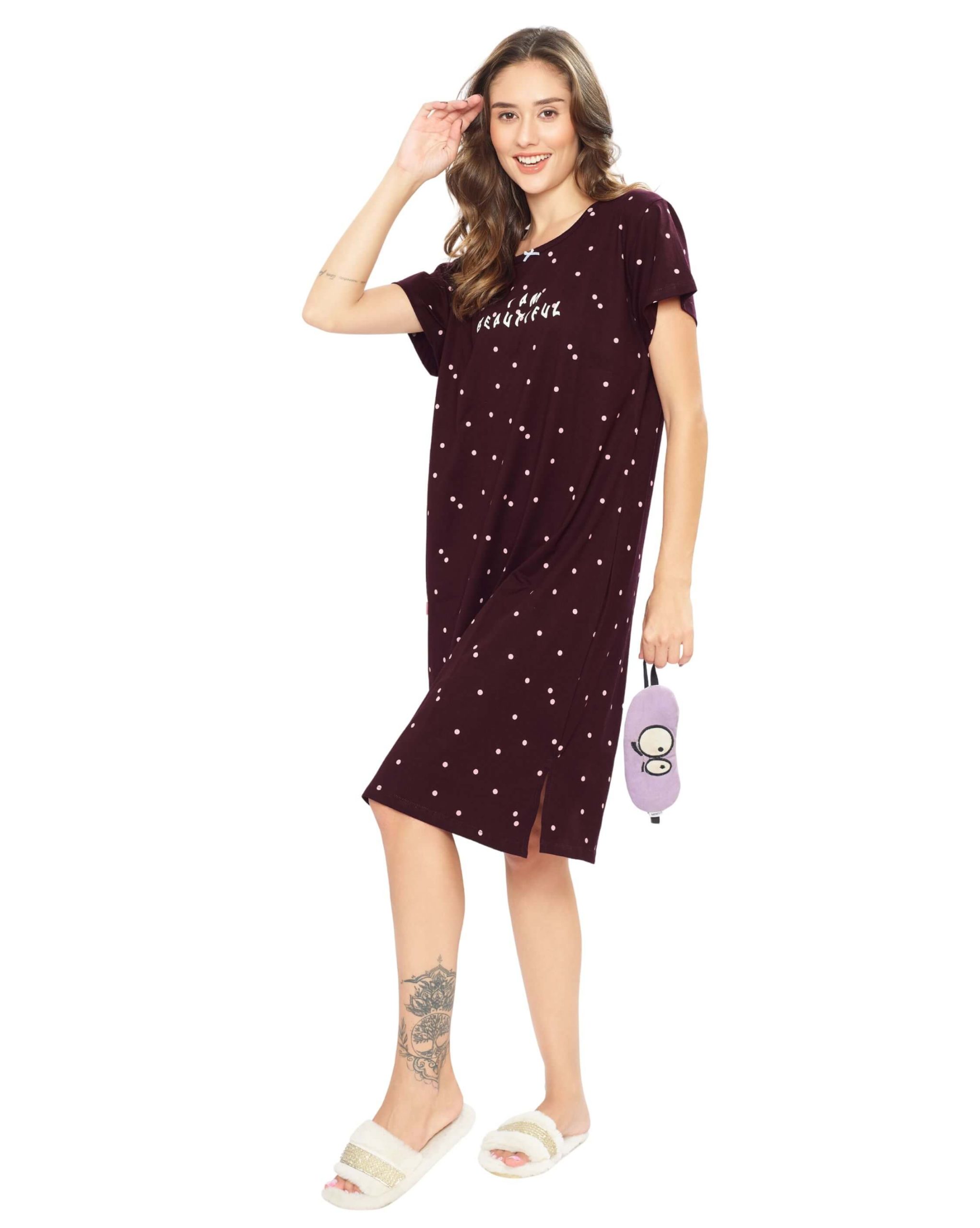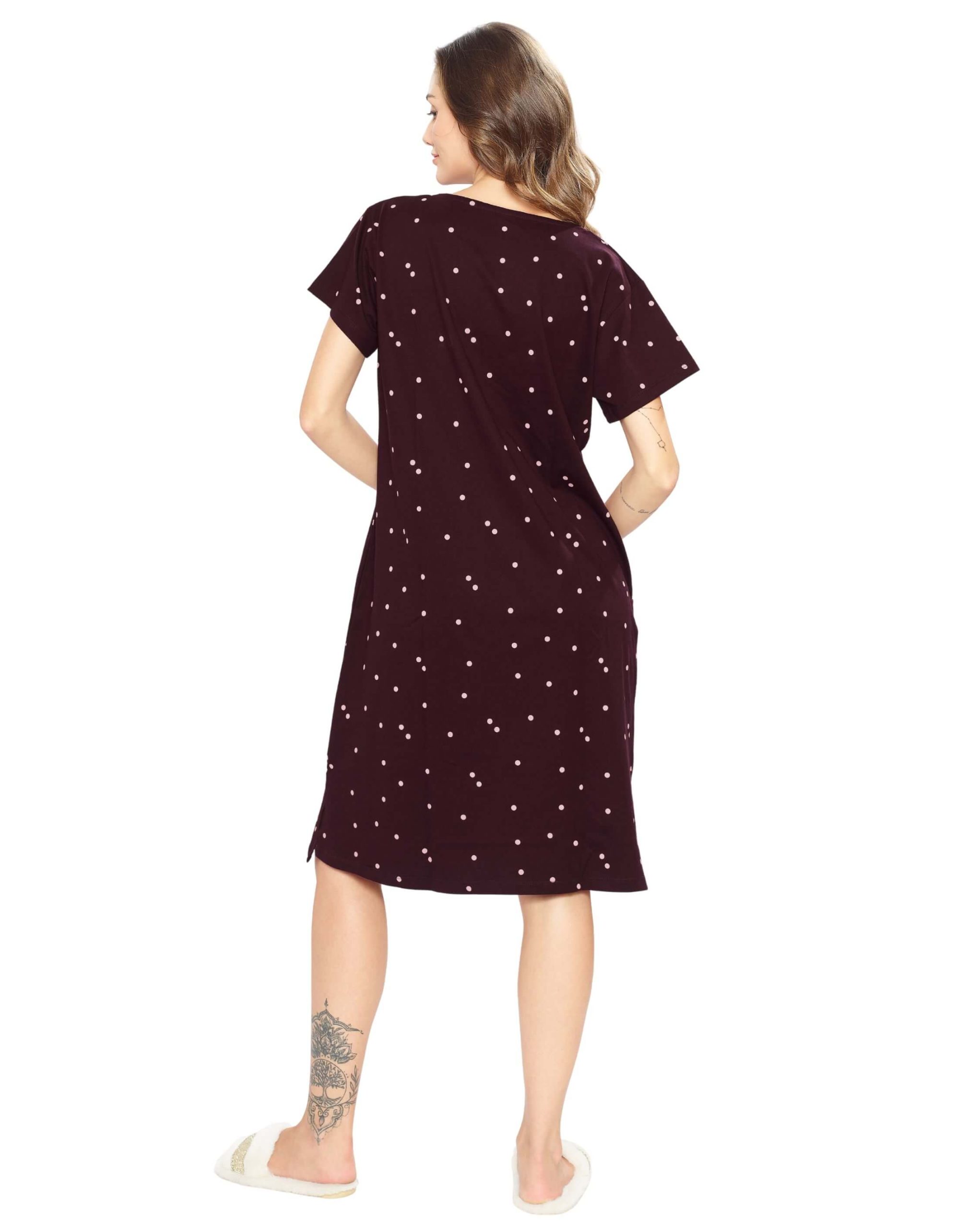 Unwind in comfort with the Women’s Maroon Dot Printed Short Nighty. Designed with a chic dot pattern and crafted from soft, breathable fabric, this nighty offers a perfect blend of style and relaxation. Ideal for lounging or sleeping, it’s available in a range of sizes to suit every preference. Upgrade your nightwear collection with this trendy piece today.