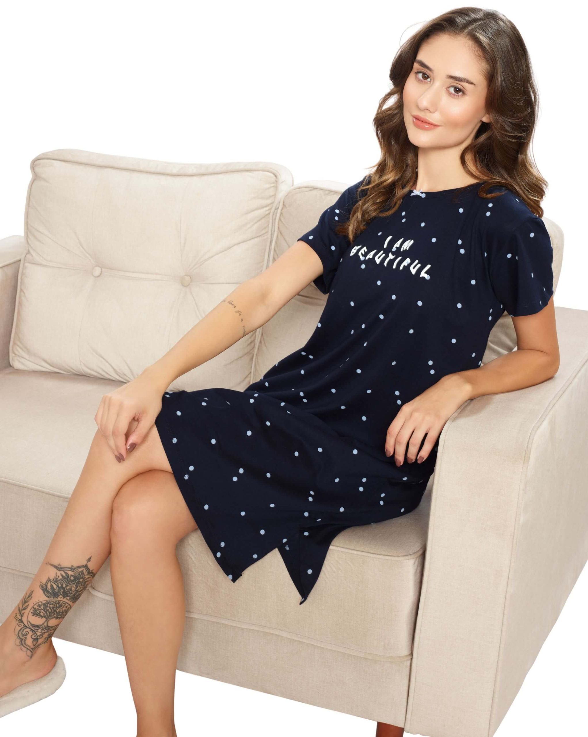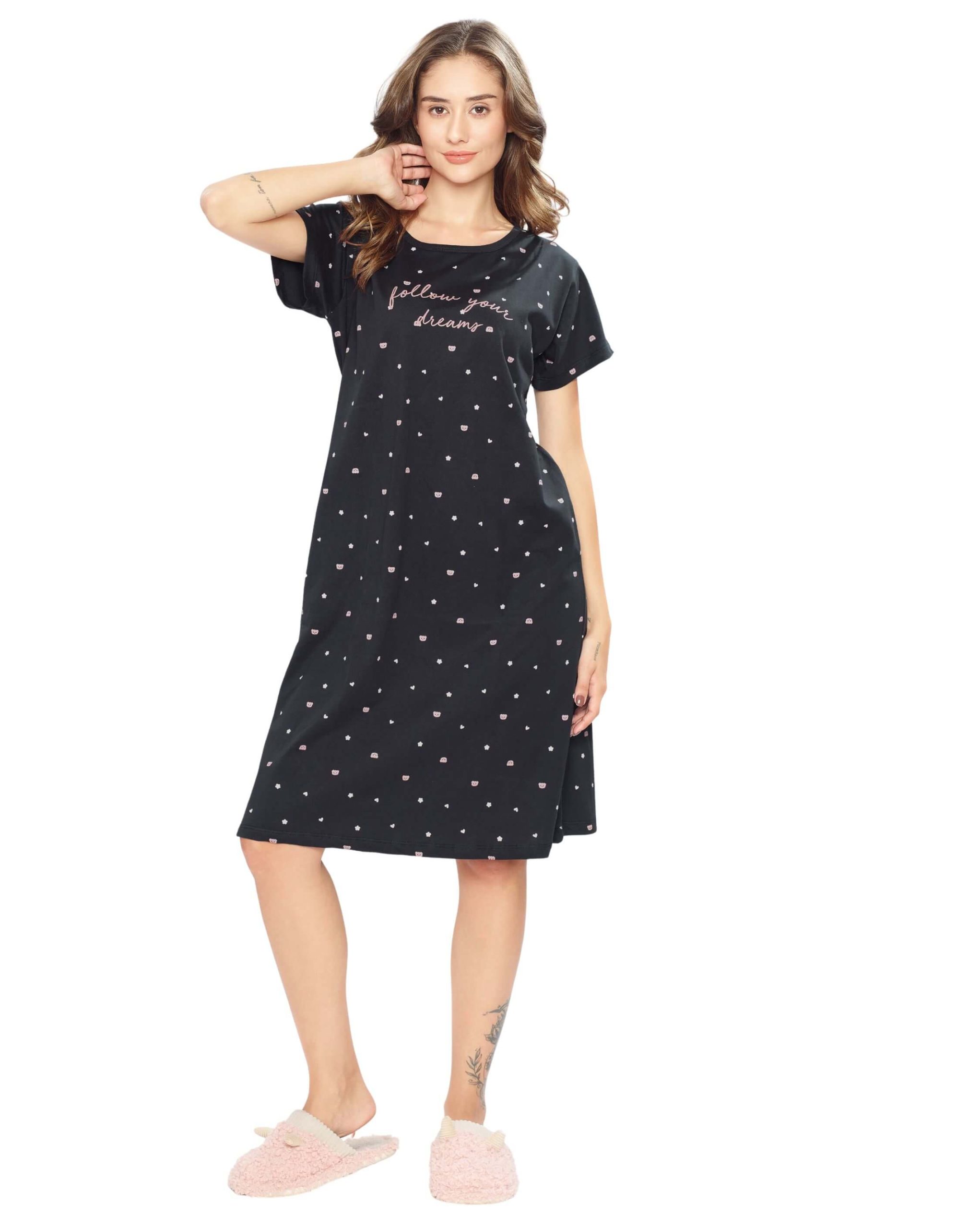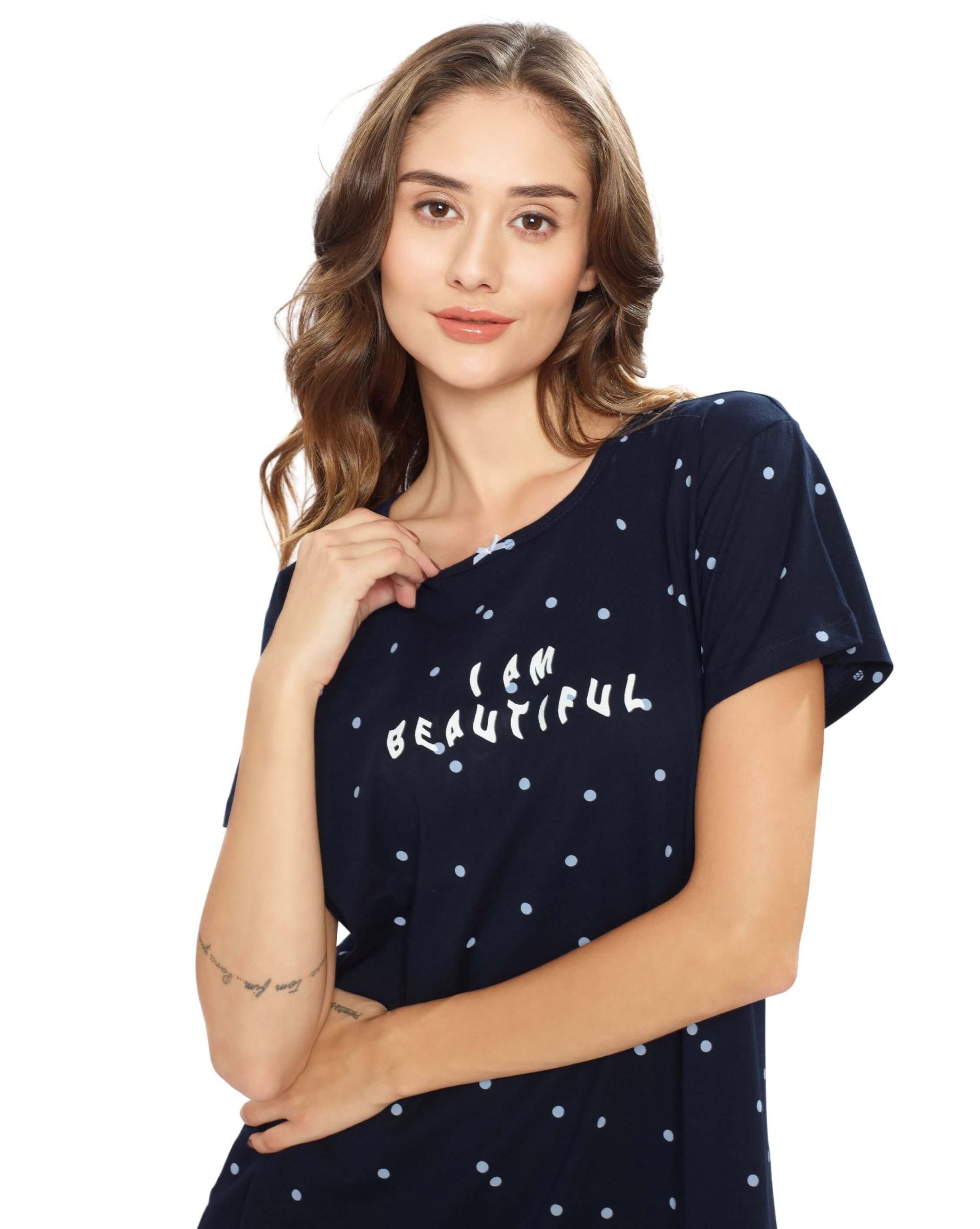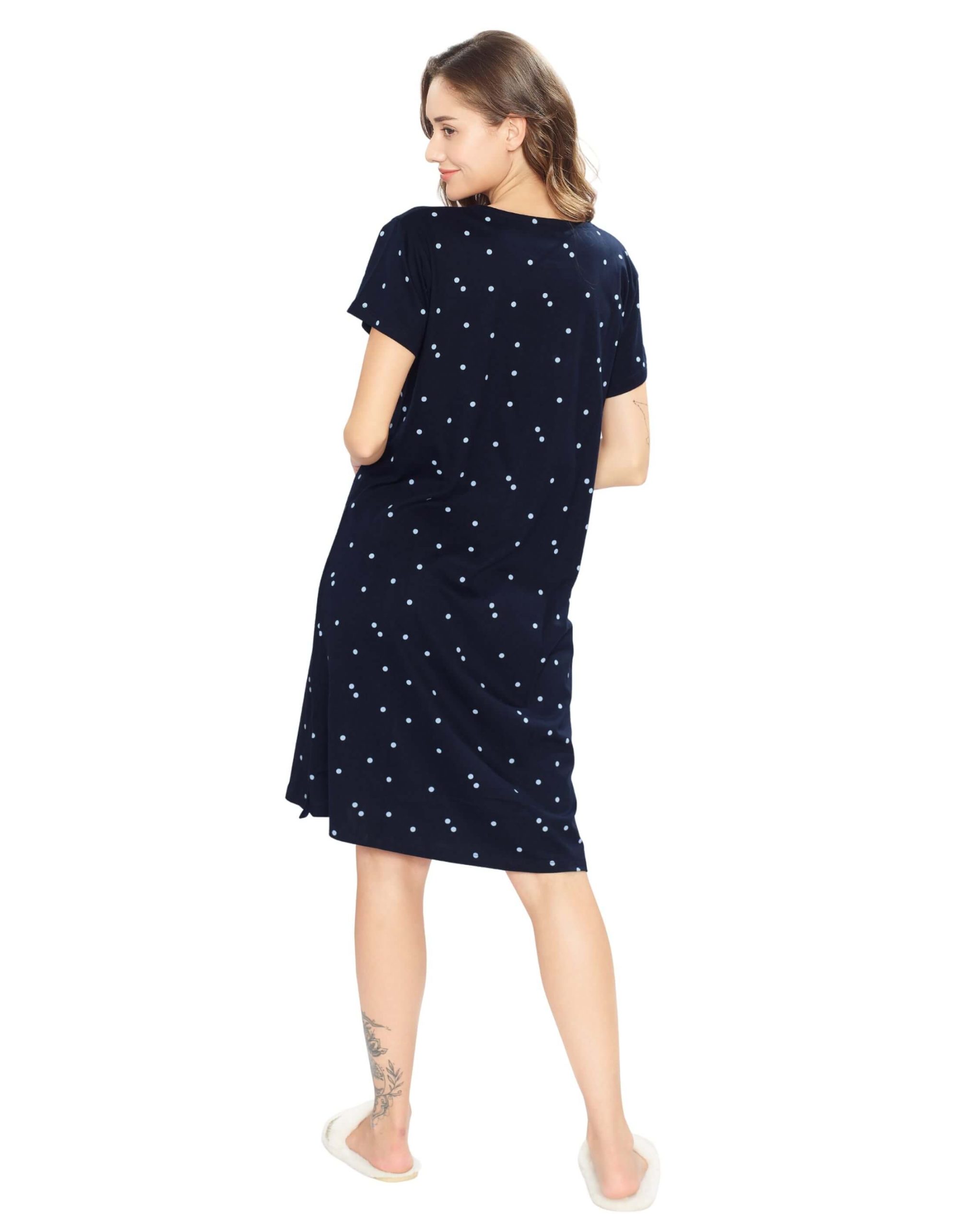 Elevate your nightwear collection with the Women’s Navy Blue Dot Printed Short Nighty. Designed with a playful dot print, this short nighty ensures comfort and style for cozy evenings and restful nights. Made from premium-quality fabric, itâs soft, breathable, and perfect for lounging or sleeping. Available in various sizes, it’s a must-have addition to your nightwear wardrobe.