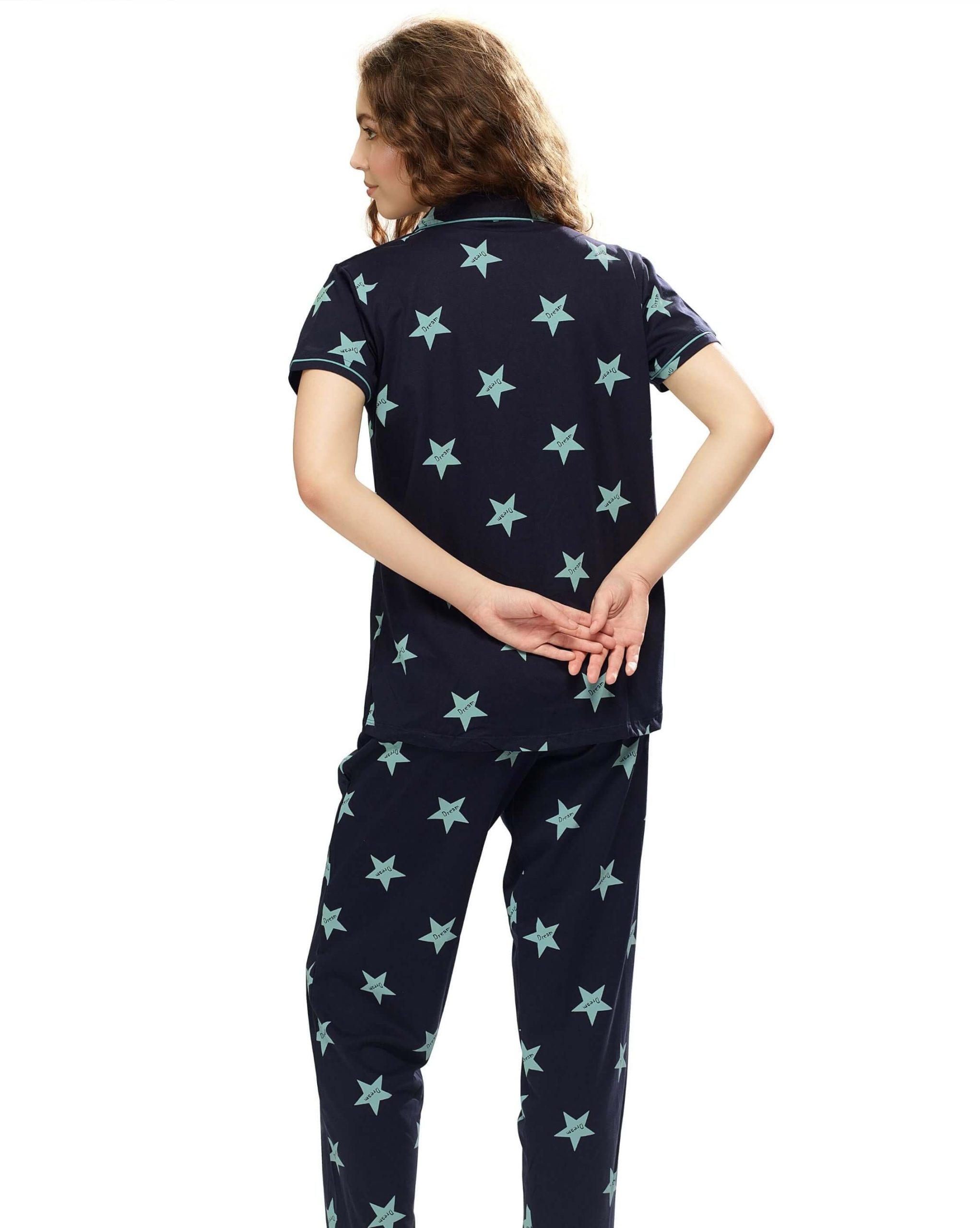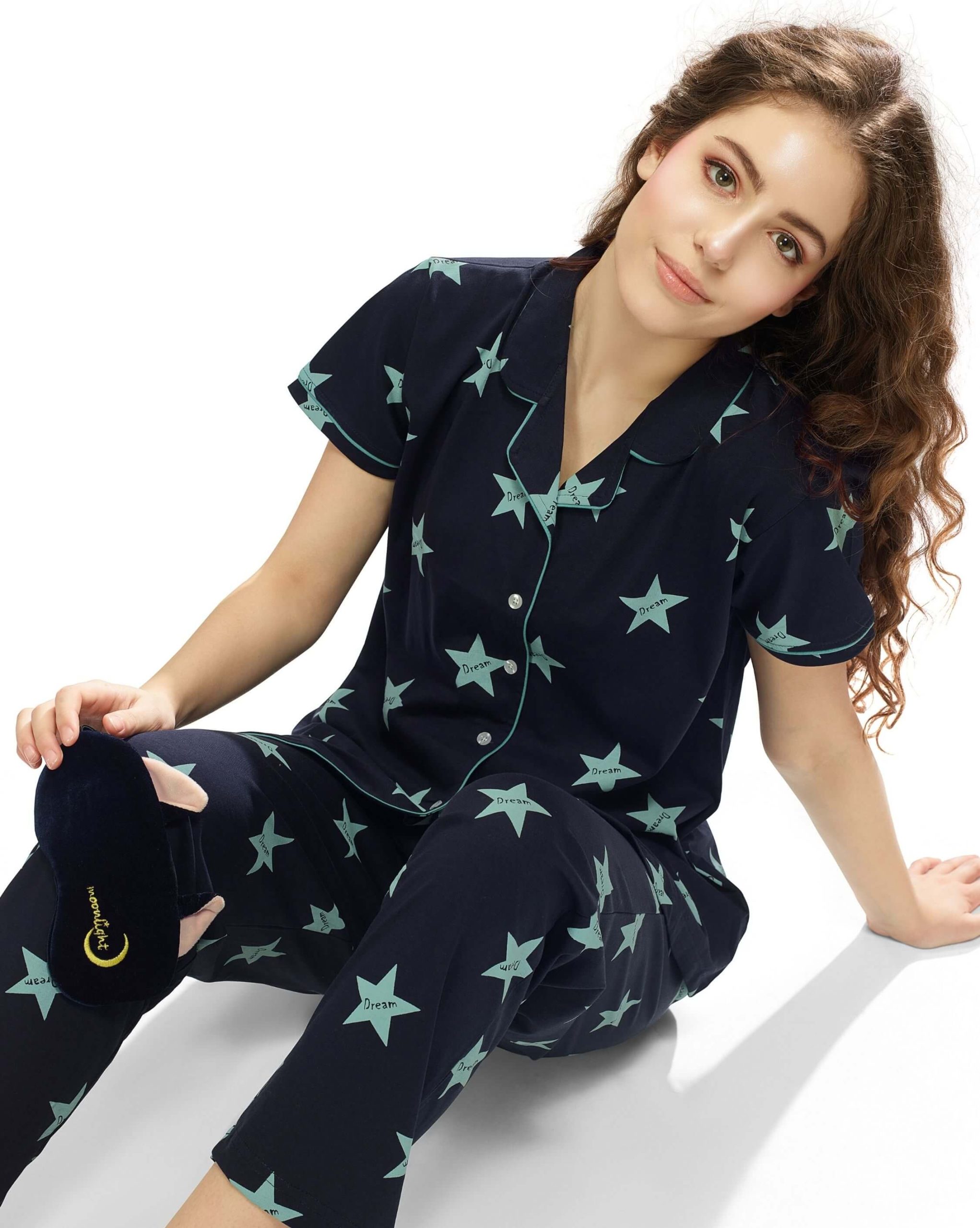 Unwind in comfort with the Weet Women’s Cotton Navy Blue “Dream” Printed Stylish Night Suit Set. Crafted from premium cotton fabric, this women’s nightwear set offers a soft and breathable feel, perfect for a peaceful night’s sleep. The elegant “Dream” print on a classic navy blue base adds a stylish and calming touch. Designed for relaxation, this comfortable night suit features a button-down shirt and elastic waist pyjama, making it an essential addition to your sleepwear collection.