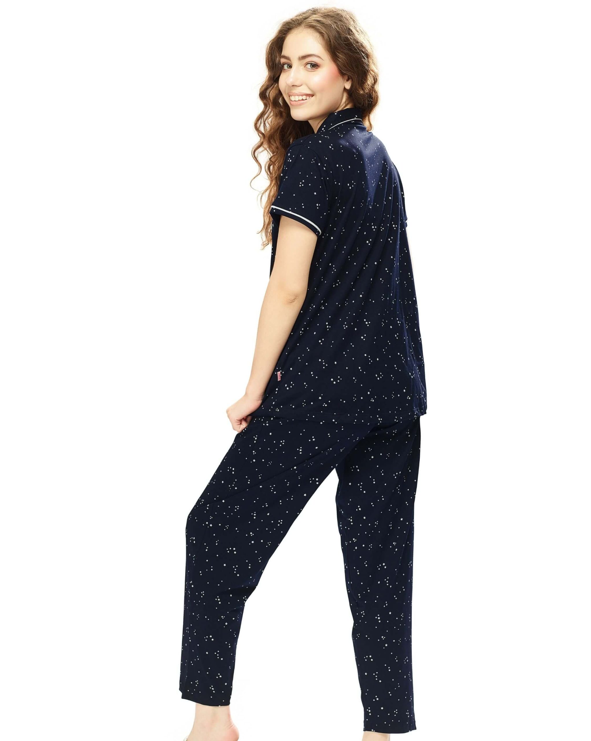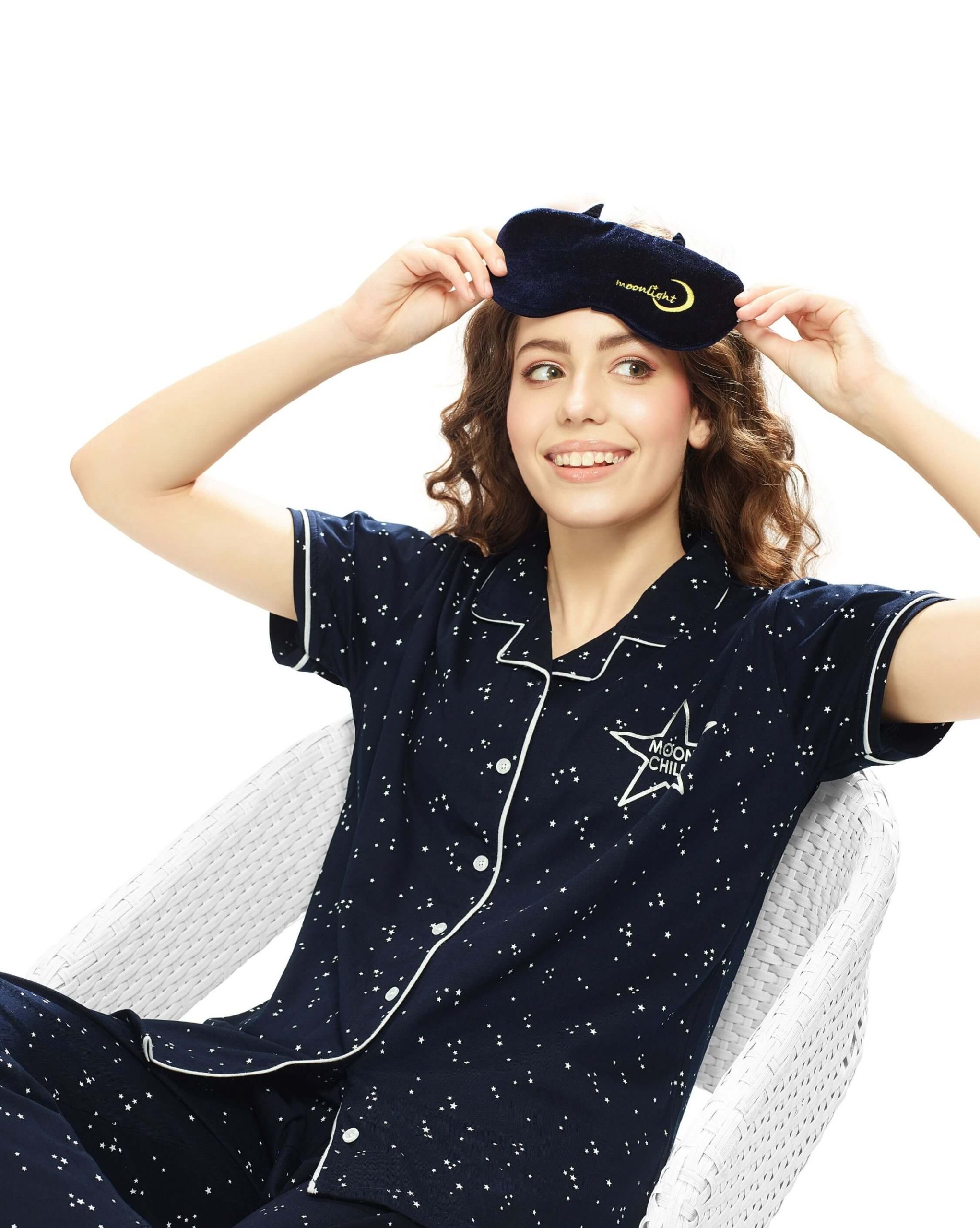 Unwind in style with the Weet Women’s Cotton Navy Blue “Moon Child” Printed Night Suit Set. Crafted from lightweight and breathable cotton, this women’s nightwear set ensures all-night comfort. The elegant navy blue shade is complemented by a chic “Moon Child” print, perfect for those who love celestial-inspired fashion. Designed with a button-down shirt and elastic waist pyjama, this trendy and cozy night suit is a must-have for your sleepwear collection.
