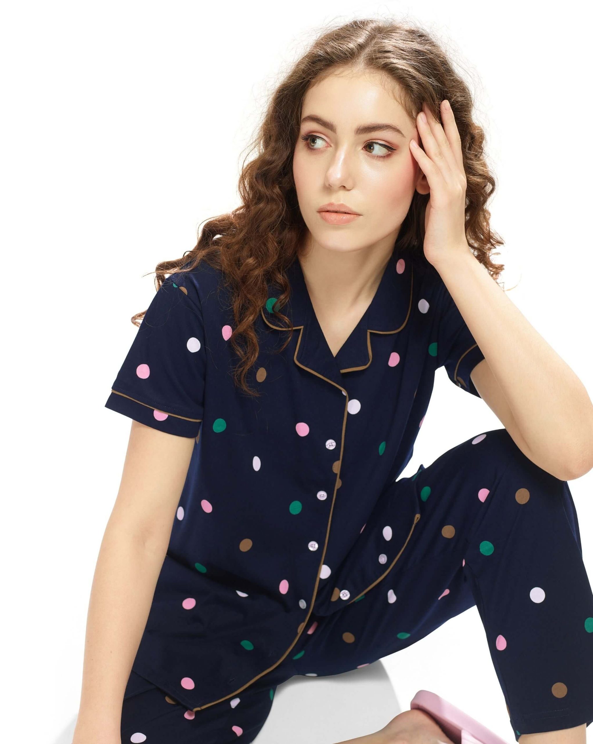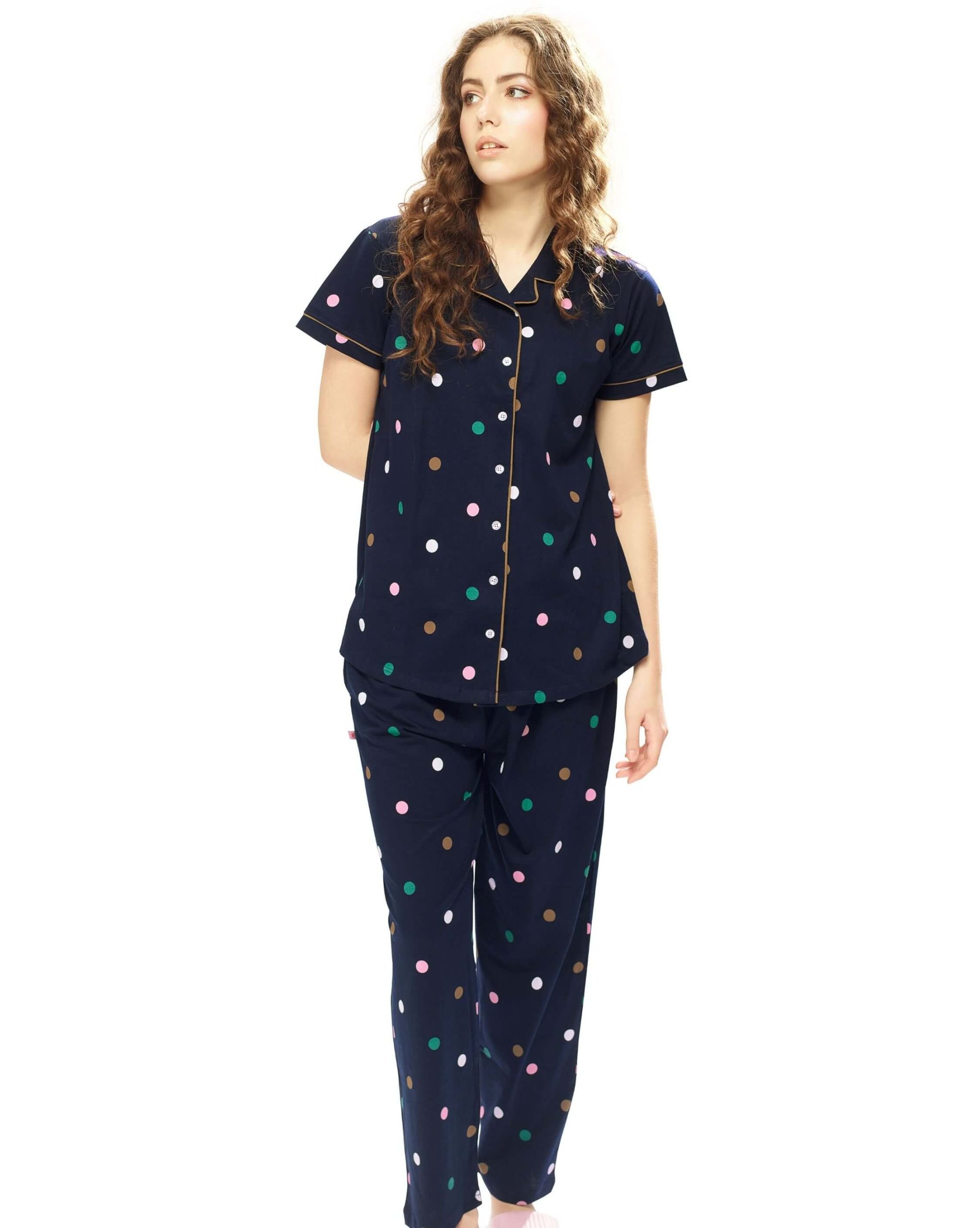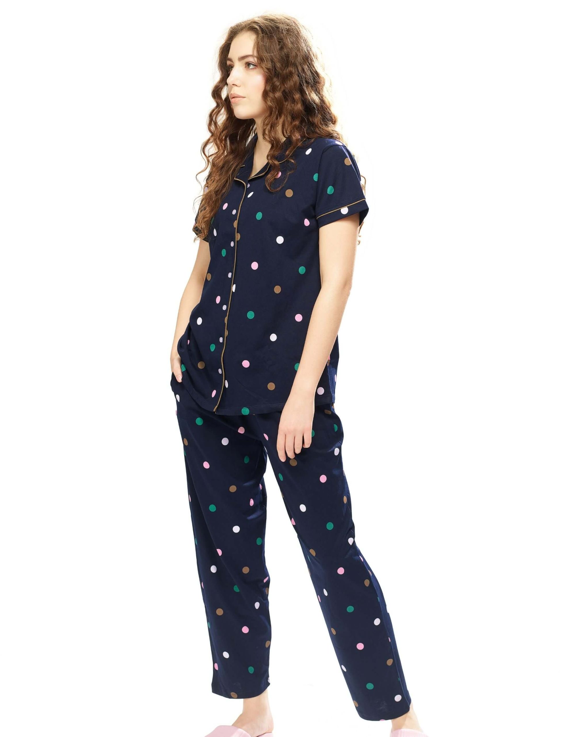 Experience ultimate comfort with the Weet Women’s Cotton Navy Blue Multidot Printed Stylish Night Suit Set. Designed for cozy nights and relaxed mornings, this women’s nightwear set is crafted from soft cotton fabric, ensuring breathability and comfort. The multidot print on a navy blue base adds a playful yet elegant touch, making it perfect for lounging in style. Featuring a button-down shirt and elastic waist pyjama, this trendy night suit is a must-have for your sleepwear collection.