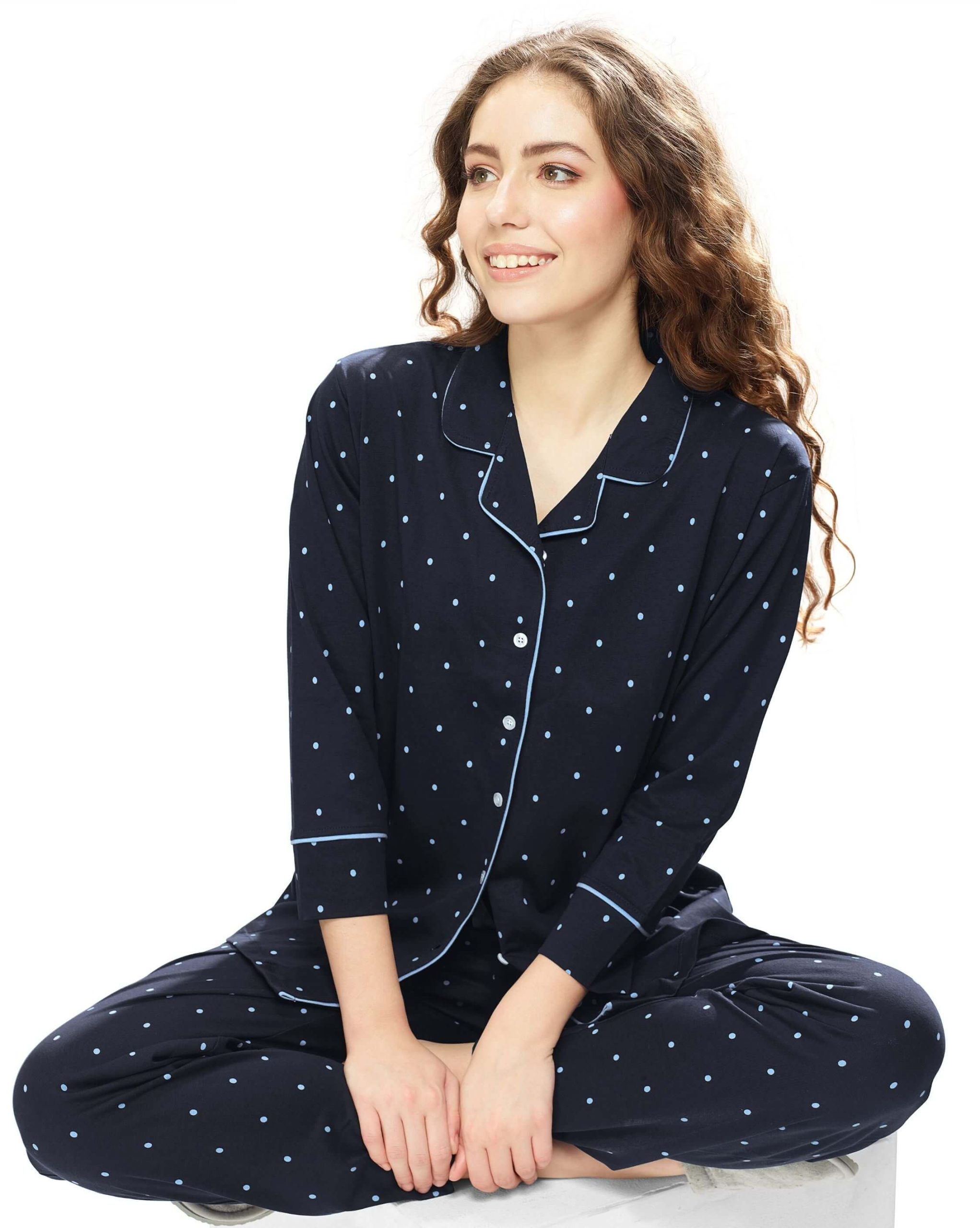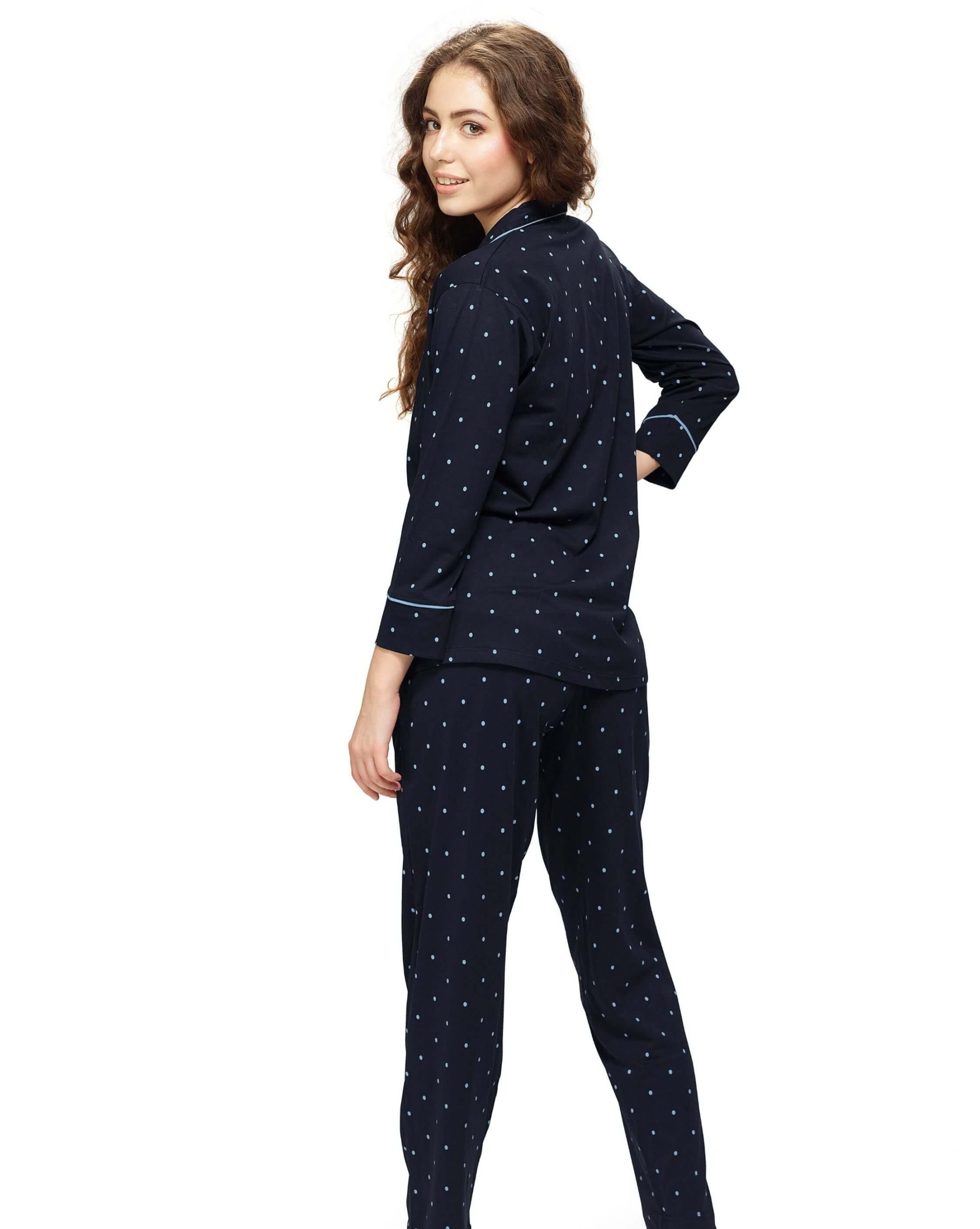This Women’s Navy Blue Shirt and Pyjama Set combines sophistication with comfort, making it perfect for lounging or a restful night. The navy blue shirt, accented with a charming small dot print, is paired with matching pyjama pants for a cohesive and stylish ensemble. Made with a soft cotton blend, this set is crafted for durability and ease.