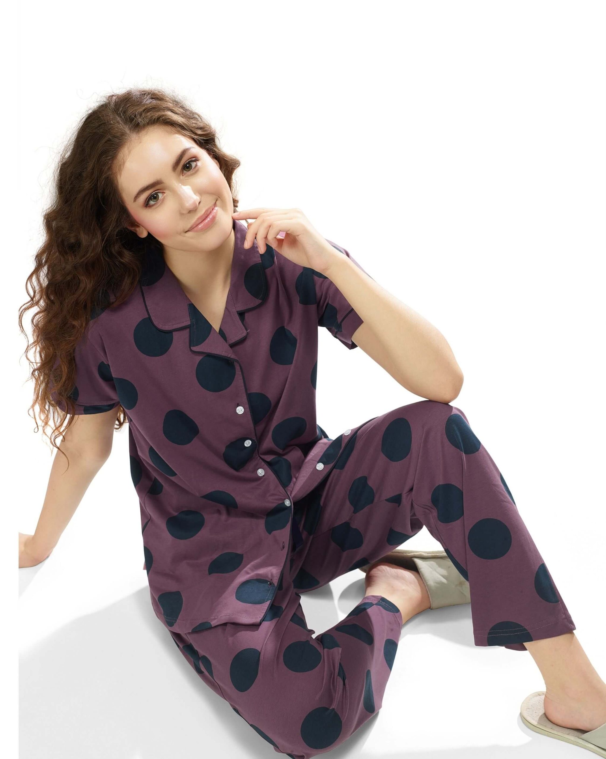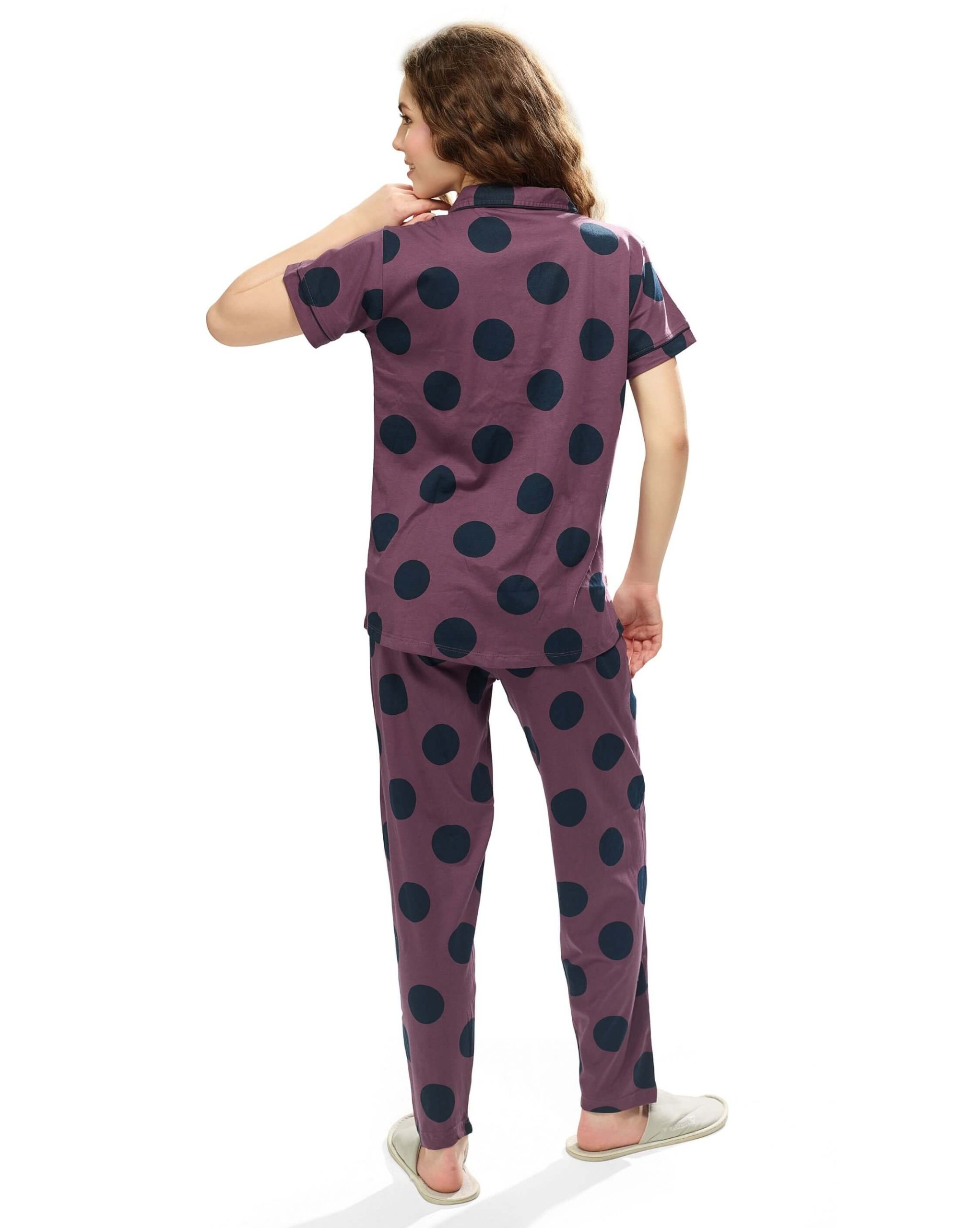 The WEET Night Suit for Women in Purple with Big Dots combines bold design with ultimate comfort. Made from soft cotton, this night dress of shirt and pyjama set ensures a restful night’s sleep or relaxing moments at home. The vibrant purple color and playful big dots pattern add a stylish, fun touch to your loungewear collection. Whether you’re lounging, sleeping, or unwinding, this set offers both comfort and style, making it a perfect addition to your sleepwear wardrobe. Stay chic and cozy with this eye-catching, comfortable set.