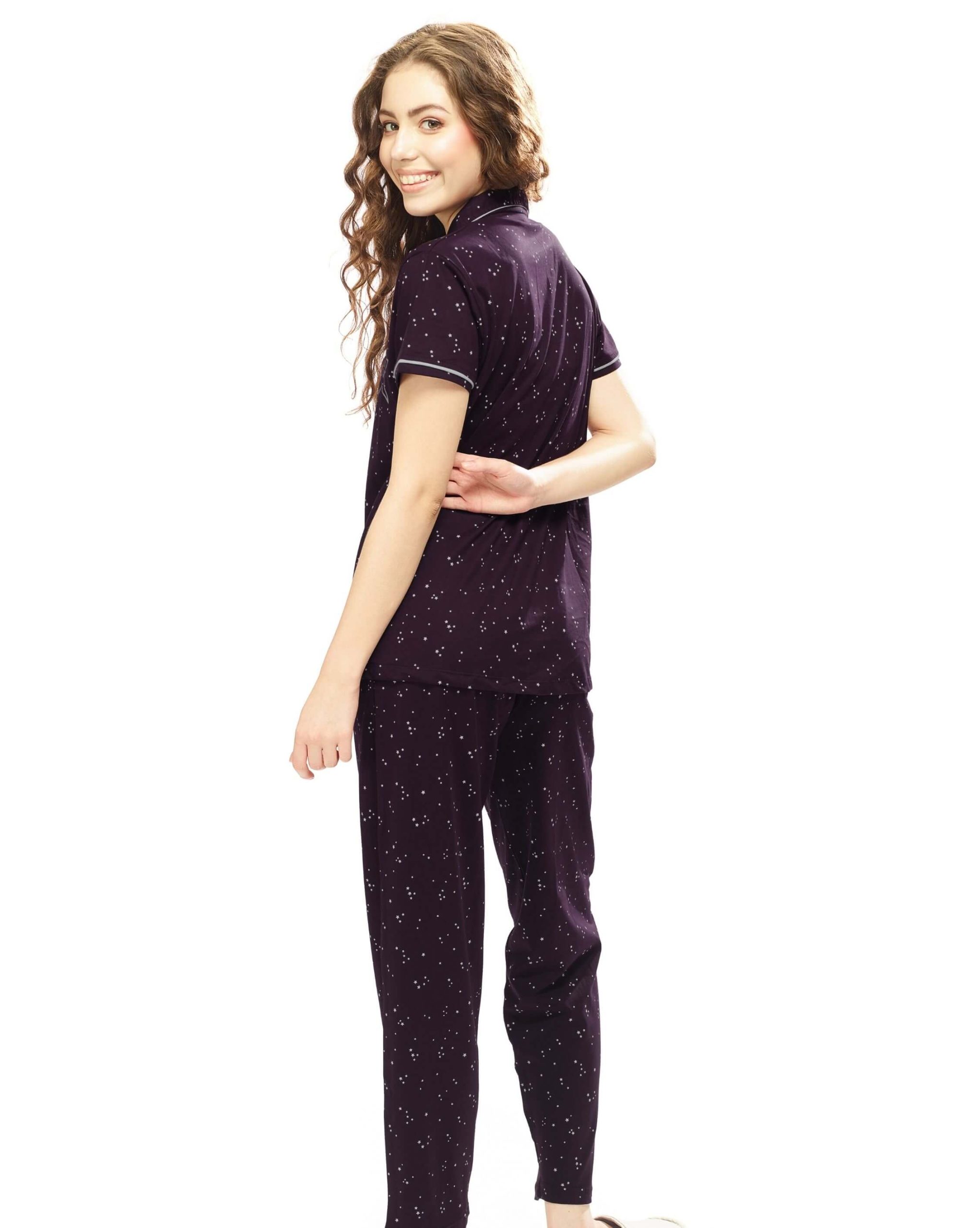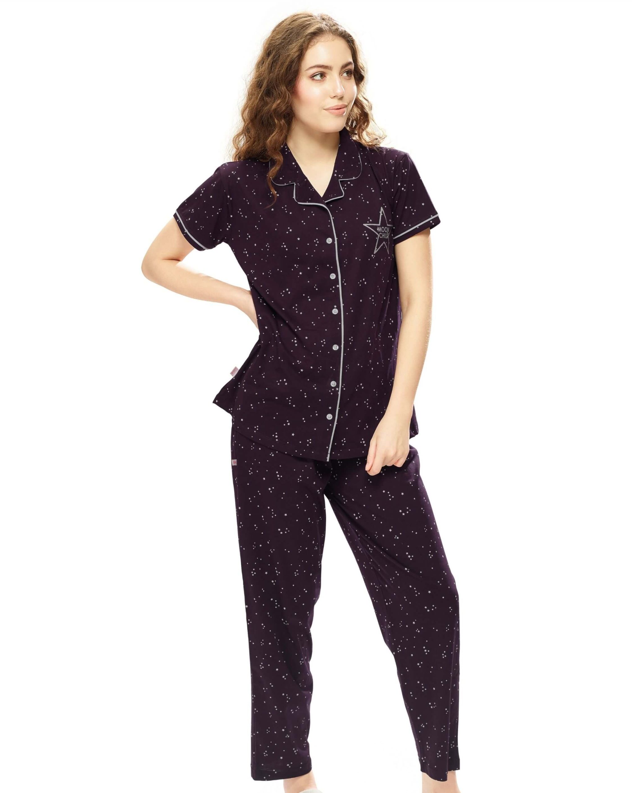 Sleep in comfort and style with the Weet Women’s Cotton Vine Star Printed Night Suit Set. Made from premium cotton fabric, this women’s nightwear set is soft, breathable, and gentle on the skin. The elegant vine color with star print adds a touch of charm to your sleepwear collection. Designed with a button-down shirt and elastic waist pyjama, this cozy and trendy night suit is ideal for lounging and a restful night’s sleep.